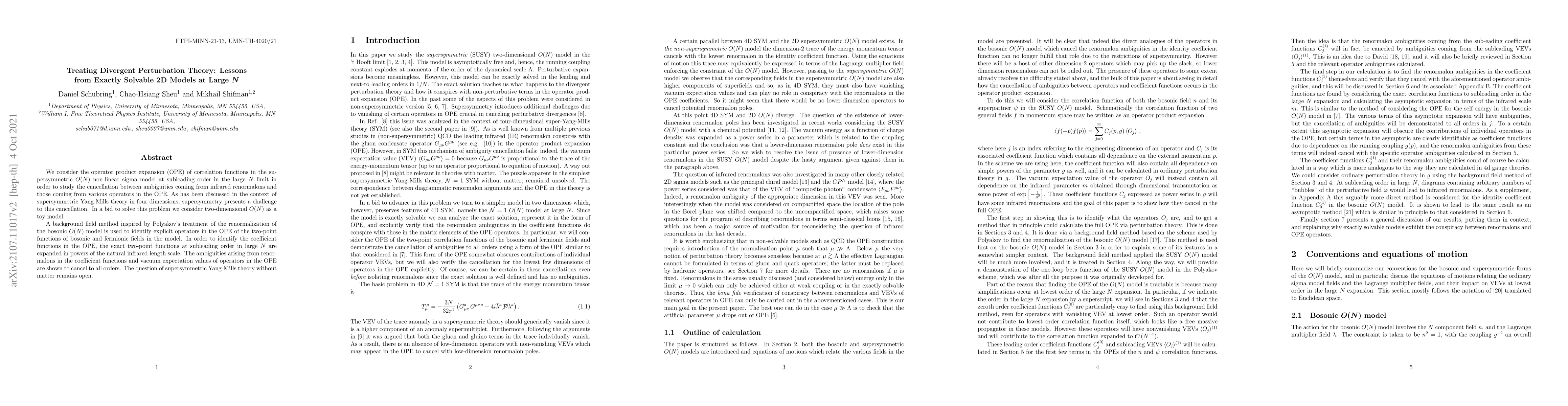 We consider the operator product expansion (OPE) of correlation functions in the supersymmetric $O(N)$ non-linear sigma model at sub-leading order in the large $N$ limit in order to study the cancellation between ambiguities coming from infrared renormalons and those coming from various operators in the OPE. As has been discussed in the context of supersymmetric Yang-Mills theory in four dimensions, supersymmetry presents a challenge to this cancellation. In a bid to solve this problem we consider $O(N)$ as a toy model. A background field method inspired by Polyakov's treatment of the renormalization of the bosonic $O(N)$ model is used to identify explicit operators in the OPE of the two-point functions of bosonic and fermionic fields in the model. In order to identify the coefficient functions in the OPE, the exact two-point functions at sub-leading order in large $N$ are expanded in powers of the natural infrared length scale. The ambiguities arising from renormalons in the coefficient functions and vacuum expectation values of operators in the OPE are shown to cancel to all orders. The question of supersymmetric Yang-Mills theory without matter remains open.