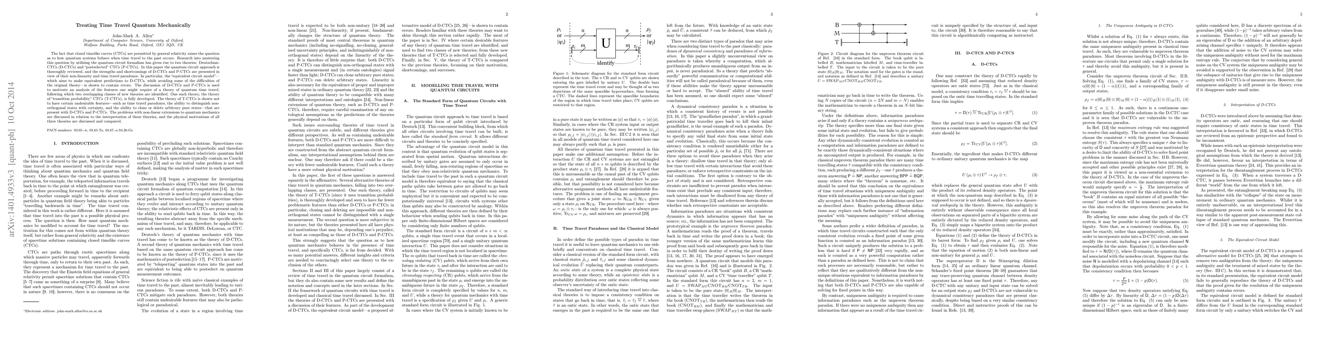 This paper reviews the quantum circuit formalism for treating time travel via closed timelike curves (CTCs), comparing Deutschian-CTCs (D-CTCs) and "postselected" CTCs (P-CTCs). It identifies issues with the "equivalent circuit model" and proposes a new theory, "transition probability" CTCs (T-CTCs), which avoids paradoxes and undesirable features like cloning or deleting states.