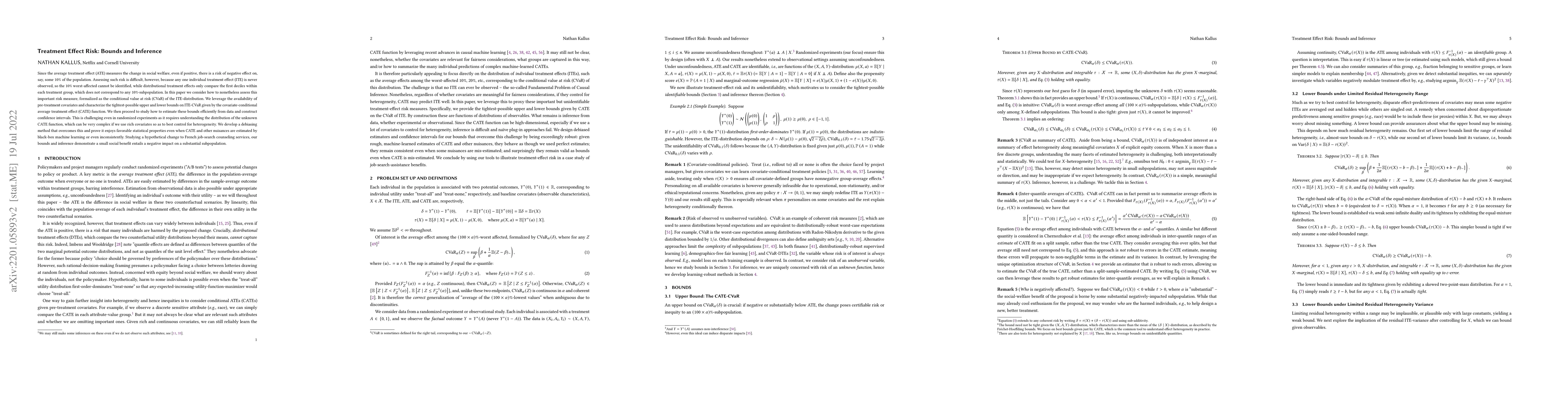 Since the average treatment effect (ATE) measures the change in social welfare, even if positive, there is a risk of negative effect on, say, some 10% of the population. Assessing such risk is difficult, however, because any one individual treatment effect (ITE) is never observed, so the 10% worst-affected cannot be identified, while distributional treatment effects only compare the first deciles within each treatment group, which does not correspond to any 10%-subpopulation. In this paper we consider how to nonetheless assess this important risk measure, formalized as the conditional value at risk (CVaR) of the ITE-distribution. We leverage the availability of pre-treatment covariates and characterize the tightest-possible upper and lower bounds on ITE-CVaR given by the covariate-conditional average treatment effect (CATE) function. We then proceed to study how to estimate these bounds efficiently from data and construct confidence intervals. This is challenging even in randomized experiments as it requires understanding the distribution of the unknown CATE function, which can be very complex if we use rich covariates so as to best control for heterogeneity. We develop a debiasing method that overcomes this and prove it enjoys favorable statistical properties even when CATE and other nuisances are estimated by black-box machine learning or even inconsistently. Studying a hypothetical change to French job-search counseling services, our bounds and inference demonstrate a small social benefit entails a negative impact on a substantial subpopulation.