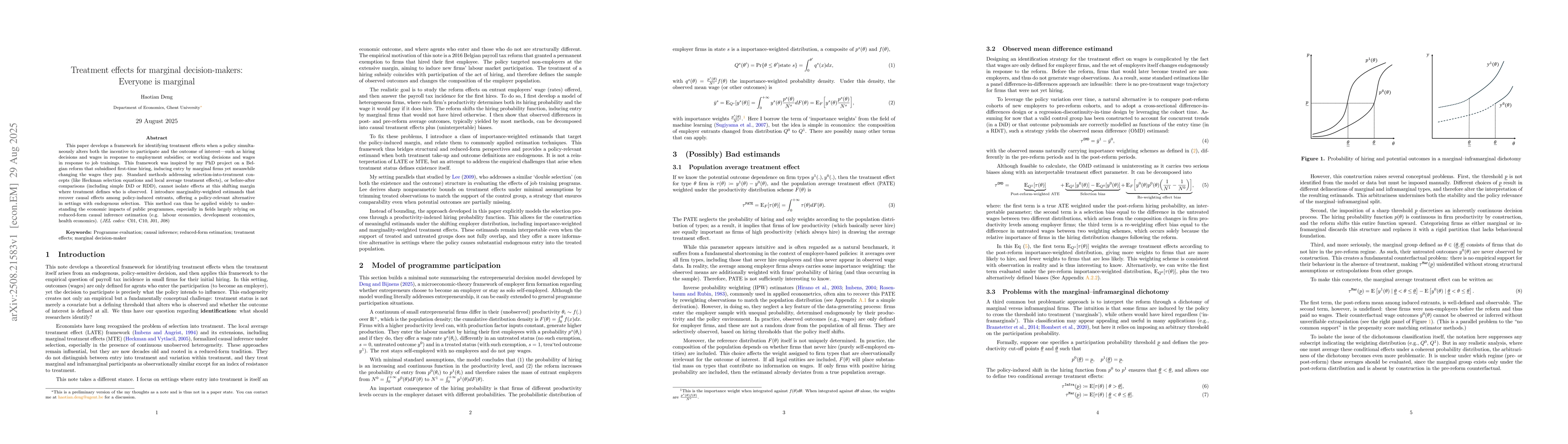 This paper develops a framework for identifying treatment effects when a policy simultaneously alters both the incentive to participate and the outcome of interest -- such as hiring decisions and wages in response to employment subsidies; or working decisions and wages in response to job trainings. This framework was inspired by my PhD project on a Belgian reform that subsidised first-time hiring, inducing entry by marginal firms yet meanwhile changing the wages they pay. Standard methods addressing selection-into-treatment concepts (like Heckman selection equations and local average treatment effects), or before-after comparisons (including simple DiD or RDD), cannot isolate effects at this shifting margin where treatment defines who is observed. I introduce marginality-weighted estimands that recover causal effects among policy-induced entrants, offering a policy-relevant alternative in settings with endogenous selection. This method can thus be applied widely to understanding the economic impacts of public programmes, especially in fields largely relying on reduced-form causal inference estimation (e.g. labour economics, development economics, health economics).