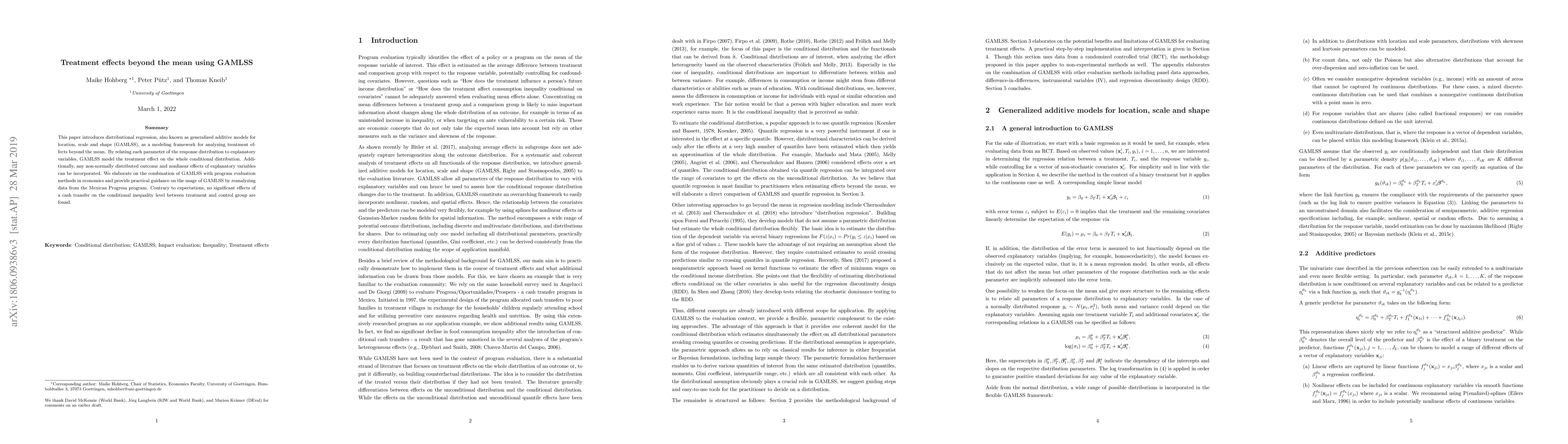 This paper utilizes GAMLSS to model treatment effects beyond the mean by analyzing the entire conditional distribution, accommodating nonnormal outcomes and nonlinear effects. The study combines GAMLSS with program evaluation methods, demonstrating its application through a reanalysis of the Mexican Progresa program data, finding no significant effects of cash transfer on conditional inequality.