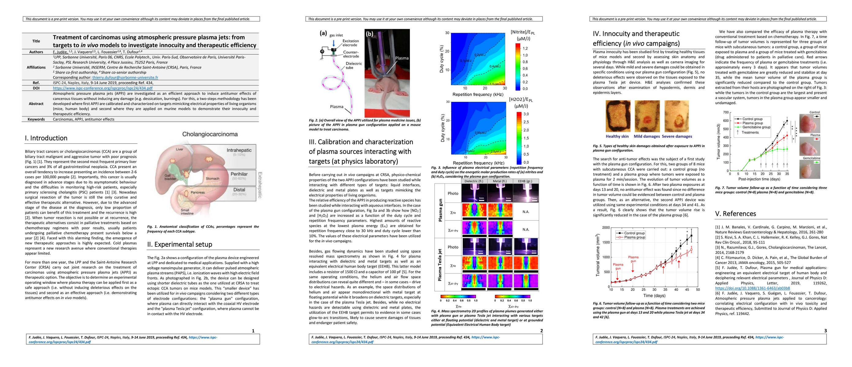 Summary: This study explores the use of atmospheric pressure plasma jets (APPJ) to induce antitumor effects in carcinomas without harming healthy tissues. A two-step methodology calibrates APPJ on target mimics and tests their safety and efficacy on murine models.