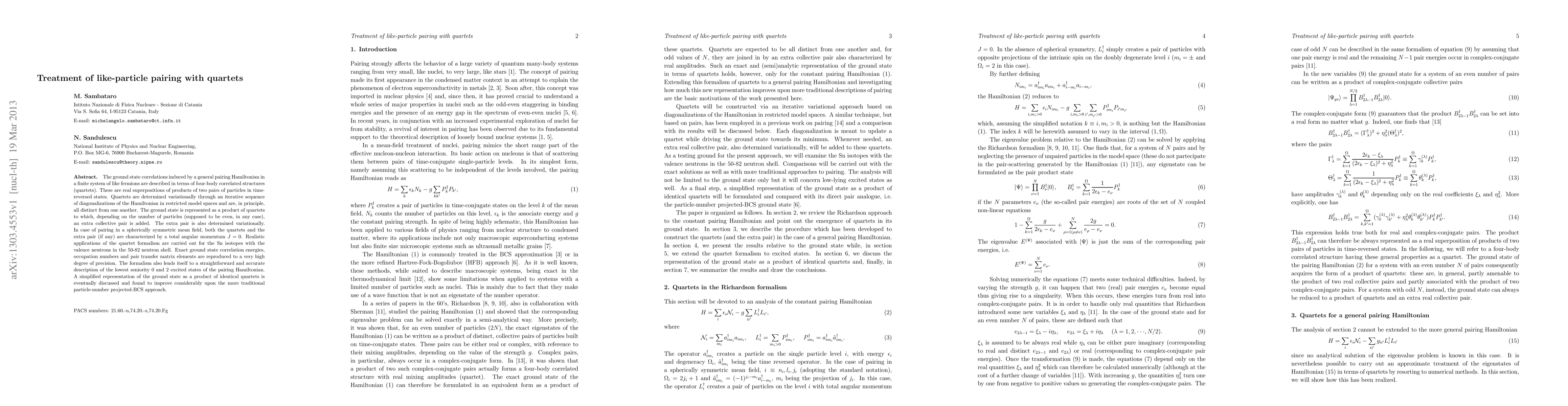 The ground state correlations induced by a general pairing Hamiltonian in a finite system of like fermions are described in terms of four-body correlated structures (quartets). These are real superpositions of products of two pairs of particles in time-reversed states. Quartets are determined variationally through an iterative sequence of diagonalizations of the Hamiltonian in restricted model spaces and are, in principle, all distinct from one another. The ground state is represented as a product of quartets to which, depending on the number of particles (supposed to be even, in any case), an extra collective pair is added. The extra pair is also determined variationally. In case of pairing in a spherically symmetric mean field, both the quartets and the extra pair (if any) are characterized by a total angular momentum J=0. Realistic applications of the quartet formalism are carried out for the Sn isotopes with the valence neutrons in the 50-82 neutron shell. Exact ground state correlation energies, occupation numbers and pair transfer matrix elements are reproduced to a very high degree of precision. The formalism also lends itself to a straightforward and accurate description of the lowest seniority 0 and 2 excited states of the pairing Hamiltonian. A simplified representation of the ground state as a product of identical quartets is eventually discussed and found to improve considerably upon the more traditional particle-number projected-BCS approach.