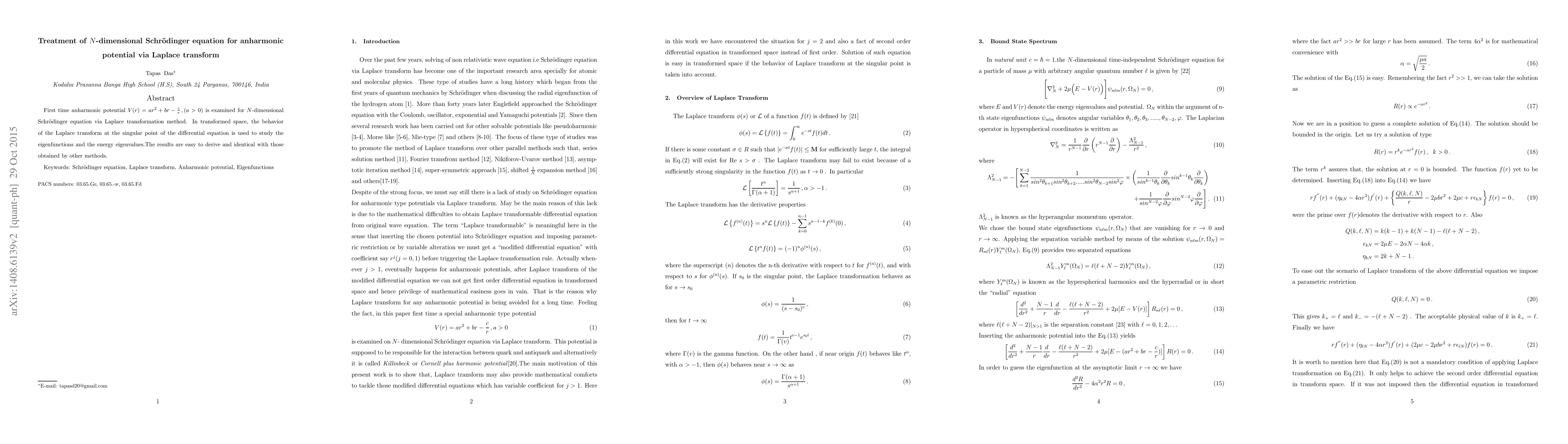 This paper investigates the $N$-dimensional Schrödinger equation for an anharmonic potential using the Laplace transform method for the first time. The study reveals the eigenfunctions and energy eigenvalues by analyzing the Laplace transform's behavior at singular points, yielding results consistent with other approaches.
