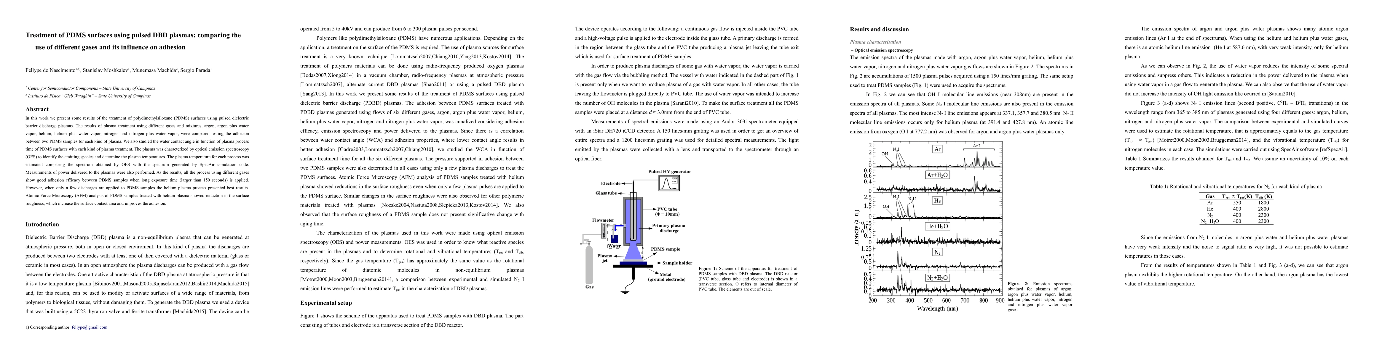 In this work we present some results of the treatment of polydimethylsiloxane (PDMS) surfaces using pulsed dielectric barrier discharge plasmas. The results of plasma treatment using different gases and mixtures, argon, argon plus water vapor, helium, helium plus water vapor, nitrogen and nitrogen plus water vapor, were compared testing the adhesion between two PDMS samples for each kind of plasma. We also studied the water contact angle in function of plasma process time of PDMS surfaces with each kind of plasma treatment. The plasma was characterized by optical emission spectroscopy (OES) to identify the emitting species and determine the plasma temperatures. The plasma temperature for each process was estimated comparing the spectrum obtained by OES with the spectrum generated by SpecAir simulation code. Measurements of power delivered to the plasmas were also performed. As the results, all the process using different gases show good adhesion efficacy between PDMS samples when long exposure time (larger than 150 seconds) is applied. However, when only a few discharges are applied to PDMS samples the helium plasma process presented best results. Atomic Force Microscopy (AFM) analysis of PDMS samples treated with helium plasma showed reduction in the surface roughness, which increase the surface contact area and improves the adhesion.