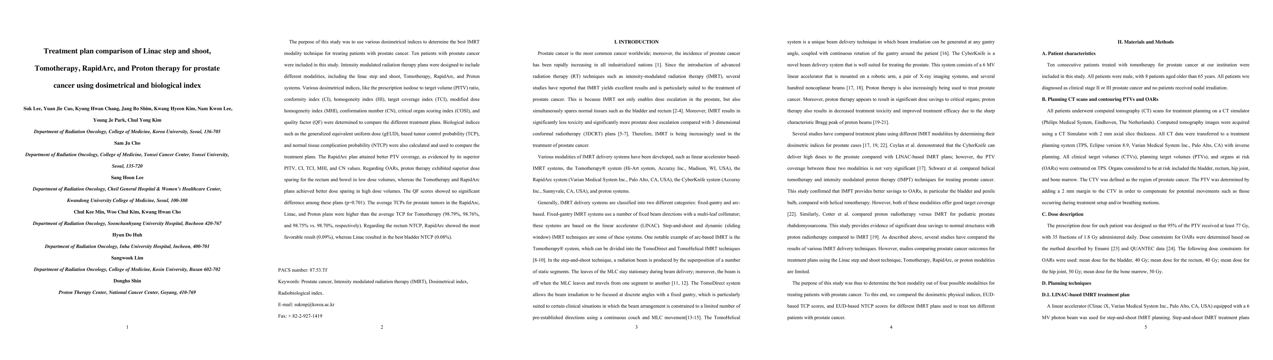 This study compared IMRT modalities for prostate cancer treatment using dosimetrical and biological indices. The RapidArc plan showed superior target coverage, while proton therapy better spared the rectum. Overall, RapidArc, Linac, and Proton plans had higher tumor control probabilities, and RapidArc had the lowest normal tissue complication probability for the rectum.
