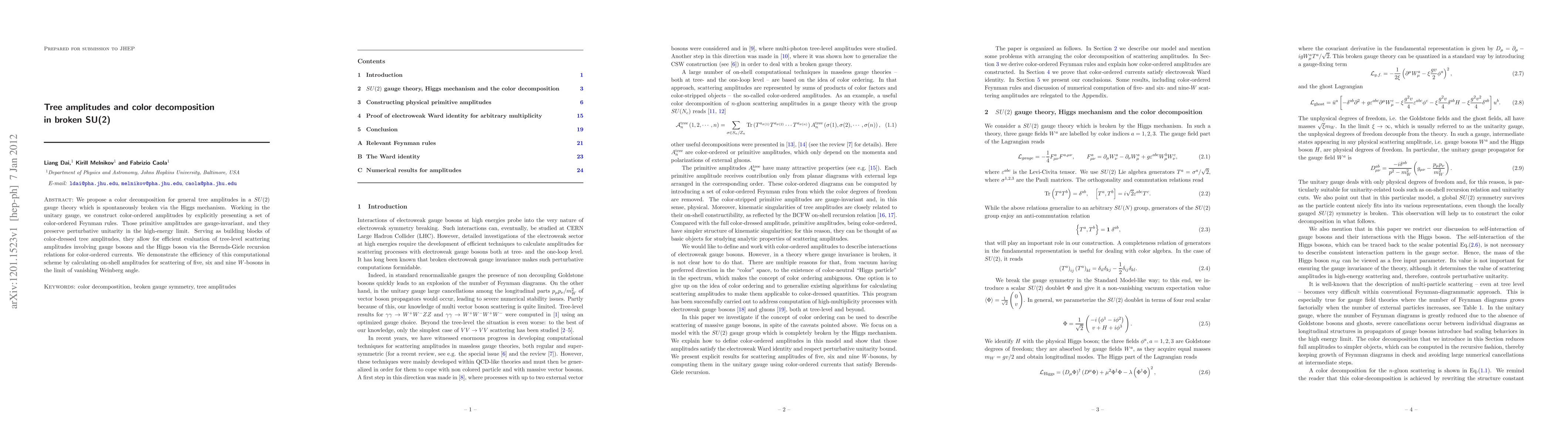 We propose a color decomposition for general tree amplitudes in a SU(2) gauge theory which is spontaneously broken via the Higgs mechanism. Working in the unitary gauge, we construct color-ordered amplitudes by explicitly presenting a set of color-ordered Feynman rules. Those primitive amplitudes are gauge-invariant, and they preserve perturbative unitarity in the high-energy limit. Serving as building blocks of color-dressed tree amplitudes, they allow for efficient evaluation of tree-level scattering amplitudes involving gauge bosons and the Higgs boson via the Berends-Giele recursion relations for color-ordered currents. We demonstrate the efficiency of this computational scheme by calculating on-shell amplitudes for scattering of five, six and nine W-bosons in the limit of vanishing Weinberg angle.
