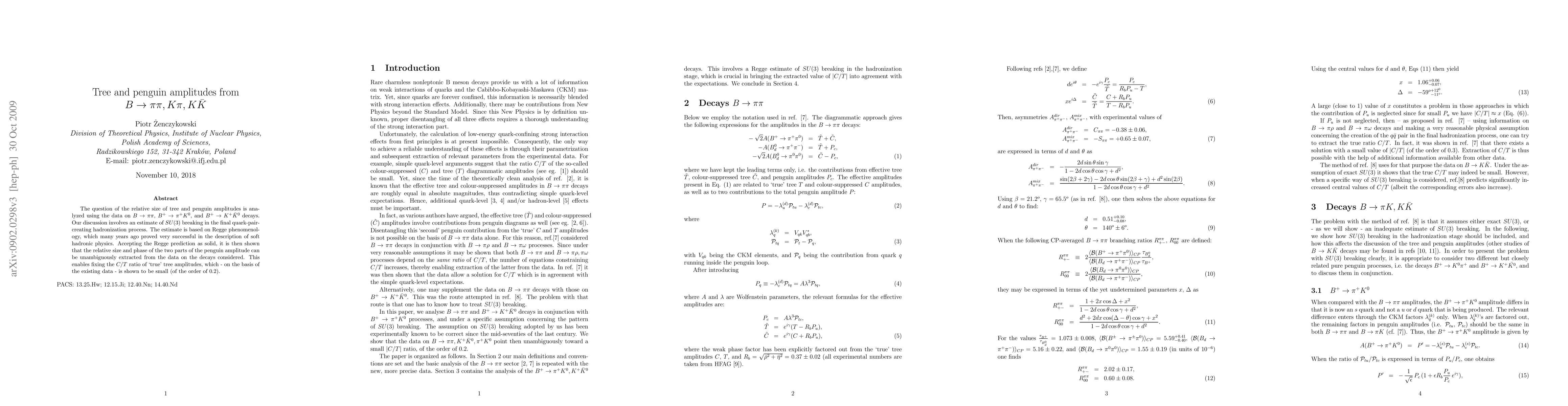 This paper analyzes the relative sizes of tree and penguin amplitudes in B meson decays to various final states, using data from B to pi pi, B^+ to pi^+ K^0, and B^+ to K^+ \bar{K}^0. It employs Regge phenomenology to estimate SU(3) breaking, concluding that the C/T ratio of tree amplitudes is small, approximately 0.2.