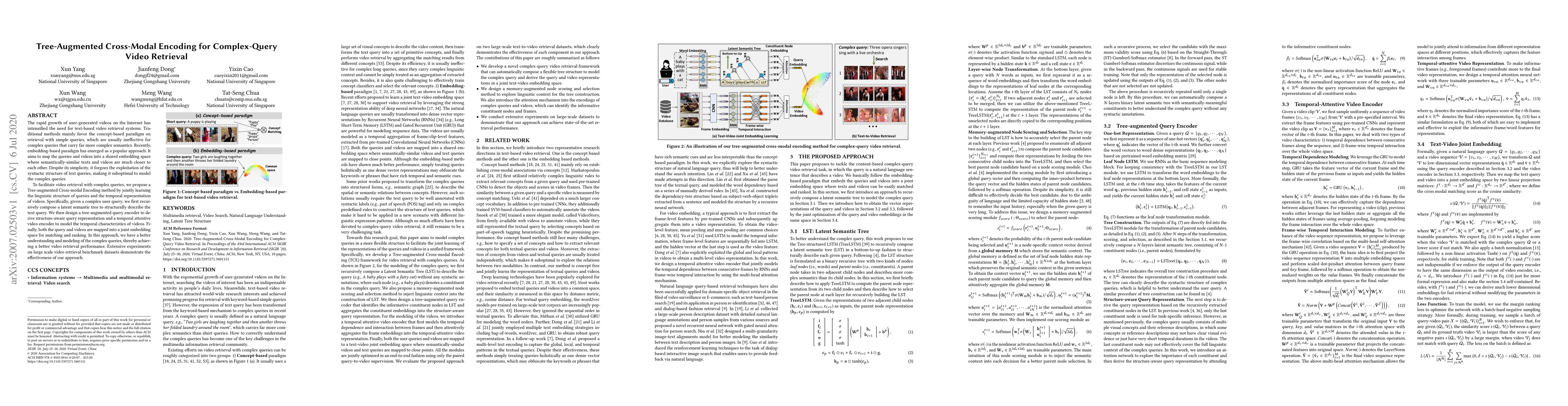 This paper proposes a Tree-augmented Cross-modal Encoding method to enhance text-based video retrieval for complex queries by leveraging both the syntactic structure of text and the temporal representation of videos. The method achieves better performance through a latent semantic tree for query representation and a temporal attentive video encoder.