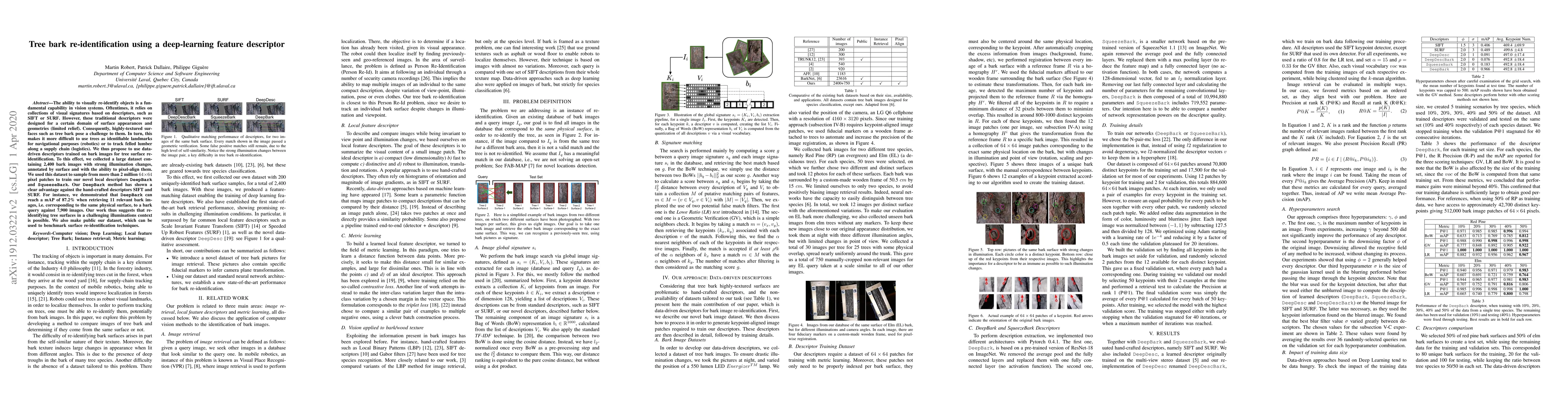 The ability to visually re-identify objects is a fundamental capability in vision systems. Oftentimes, it relies on collections of visual signatures based on descriptors, such as SIFT or SURF. However, these traditional descriptors were designed for a certain domain of surface appearances and geometries (limited relief). Consequently, highly-textured surfaces such as tree bark pose a challenge to them. In turn, this makes it more difficult to use trees as identifiable landmarks for navigational purposes (robotics) or to track felled lumber along a supply chain (logistics). We thus propose to use data-driven descriptors trained on bark images for tree surface re-identification. To this effect, we collected a large dataset containing 2,400 bark images with strong illumination changes, annotated by surface and with the ability to pixel-align them. We used this dataset to sample from more than 2 million 64x64 pixel patches to train our novel local descriptors DeepBark and SqueezeBark. Our DeepBark method has shown a clear advantage against the hand-crafted descriptors SIFT and SURF. For instance, we demonstrated that DeepBark can reach a mAP of 87.2% when retrieving 11 relevant bark images, i.e. corresponding to the same physical surface, to a bark query against 7,900 images. Our work thus suggests that re-identifying tree surfaces in a challenging illuminations context is possible. We also make public our dataset, which can be used to benchmark surface re-identification techniques.