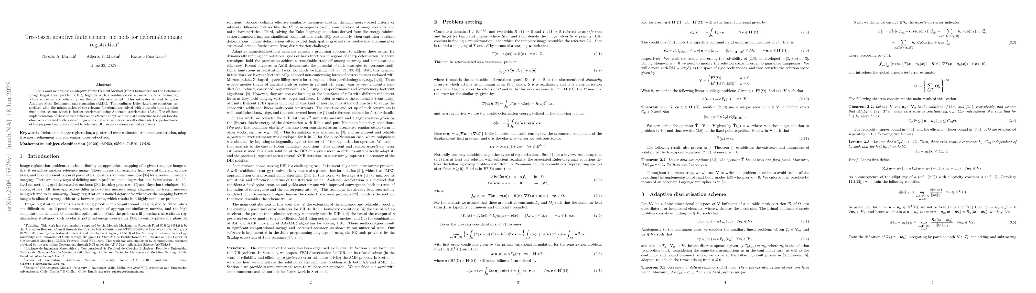 In this work we propose an adaptive Finite Element Method (FEM) formulation for the Deformable Image Registration problem (DIR) together with a residual-based a posteriori error estimator, whose efficiency and reliability are theoretically established. This estimator is used to guide Adaptive Mesh Refinement and coarsening (AMR). The nonlinear Euler-Lagrange equations associated with the minimisation of the relevant functional are solved with a pseudo time-stepping fixed-point scheme which is further accelerated using Anderson Acceleration (AA). The efficient implementation of these solvers relies on an efficient adaptive mesh data structure based on forests-of-octrees endowed with space-filling-curves. Several numerical results illustrate the performance of the proposed methods applied to adaptive DIR in application-oriented problems.
