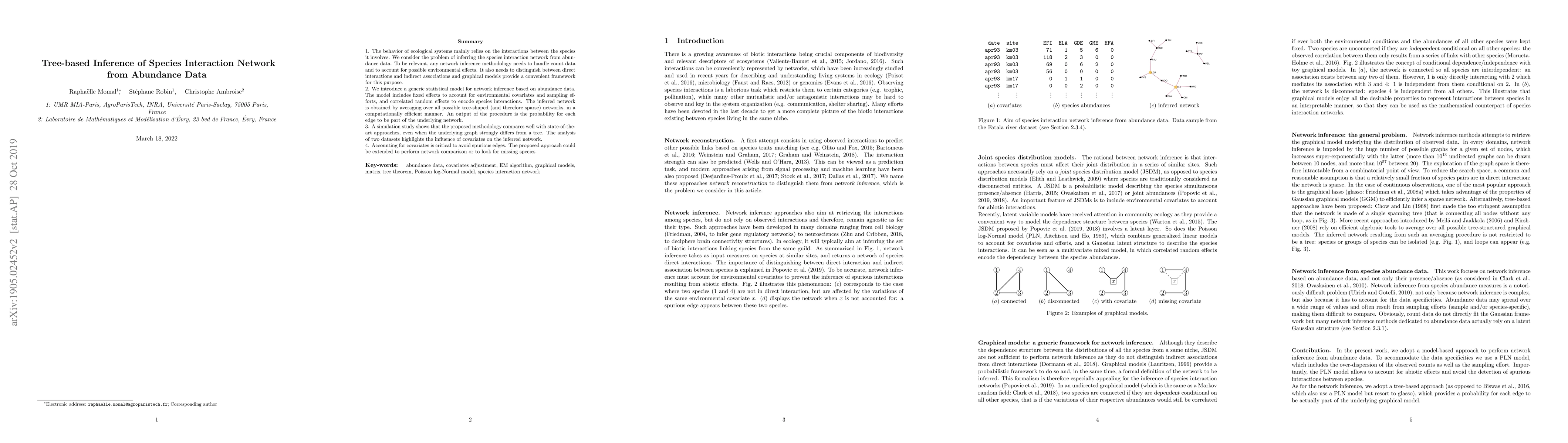 This research introduces a tree-based statistical model to infer species interaction networks from abundance data, accounting for environmental effects and distinguishing direct interactions. The method averages over tree-shaped networks for computational efficiency, demonstrating competitiveness in simulations and highlighting covariate importance in real datasets.