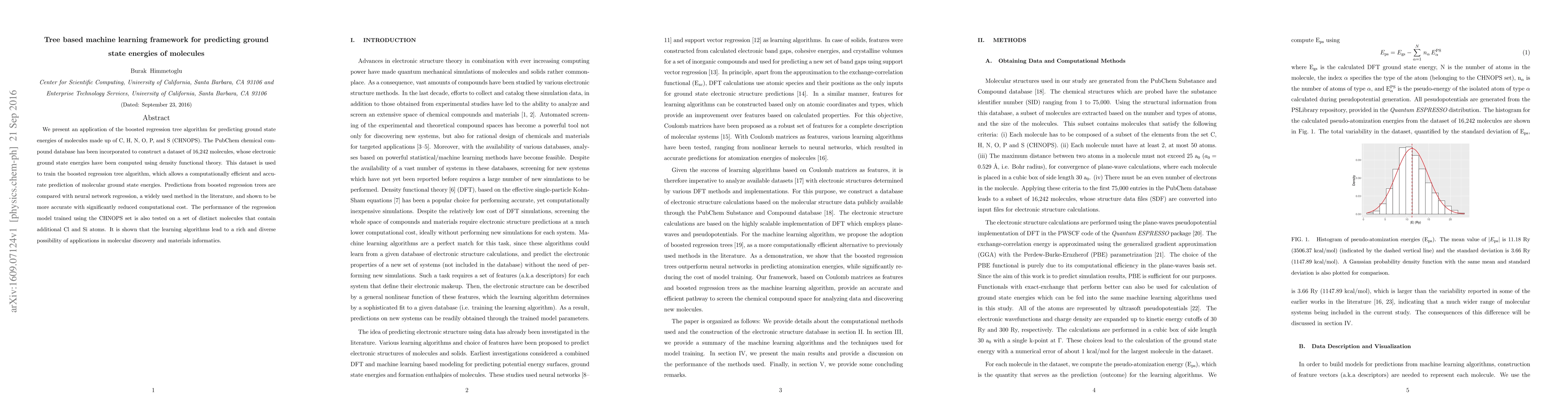 This paper applies boosted regression trees to predict ground state energies of CHNOPS molecules, trained on a dataset from PubChem. The method is shown to be more accurate and computationally efficient than neural networks, with potential applications in molecular discovery and materials informatics.
