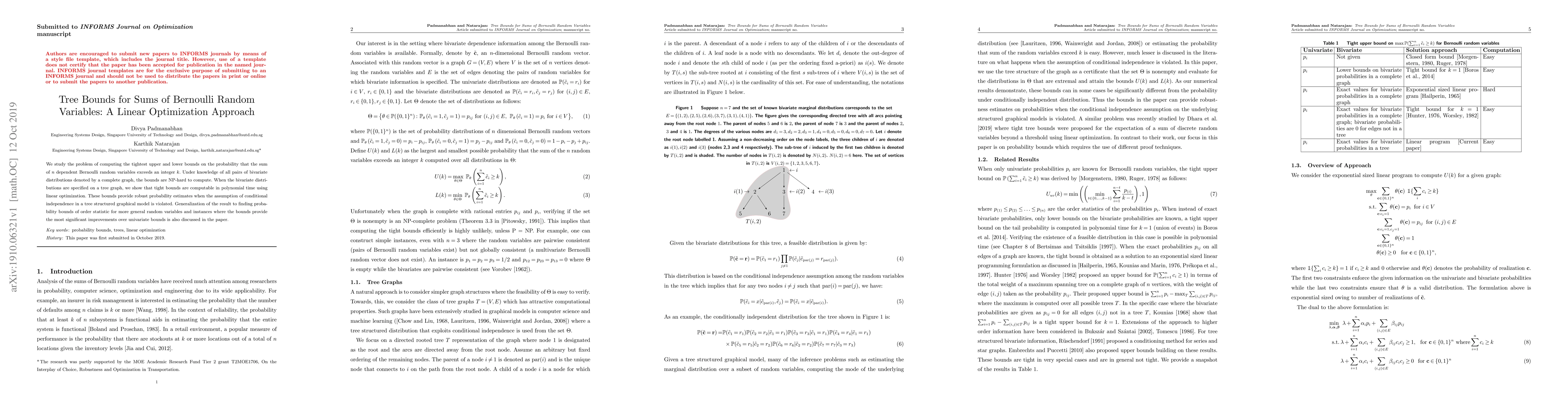 This paper investigates the computation of tight bounds on the probability that the sum of $n$ dependent Bernoulli random variables exceeds a threshold $k$. It demonstrates that while these bounds are NP-hard to compute under full bivariate distribution knowledge, they can be efficiently computed in polynomial time using linear optimization when the distributions are specified on a tree graph.