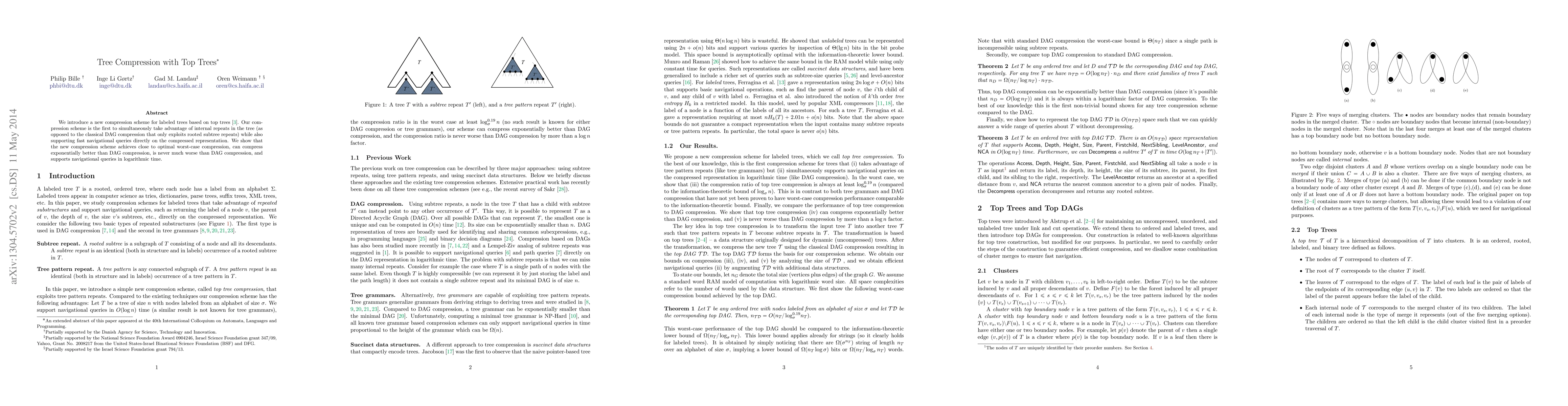 A new compression scheme for labeled trees, called Tree Compression with Top Trees, achieves near-optimal worst-case compression while supporting fast navigational queries in logarithmic time.