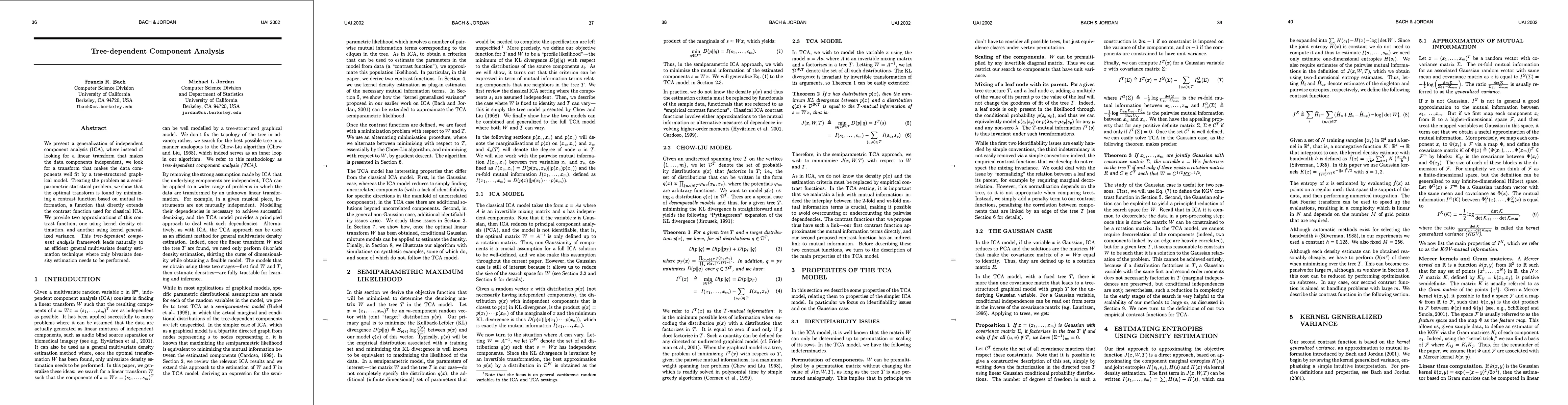 This paper generalizes independent component analysis to tree-dependent component analysis, optimizing a transform based on mutual information to fit data components with a tree-structured model. It provides two methods for approximating this contrast function, leading to efficient multivariate density estimation.