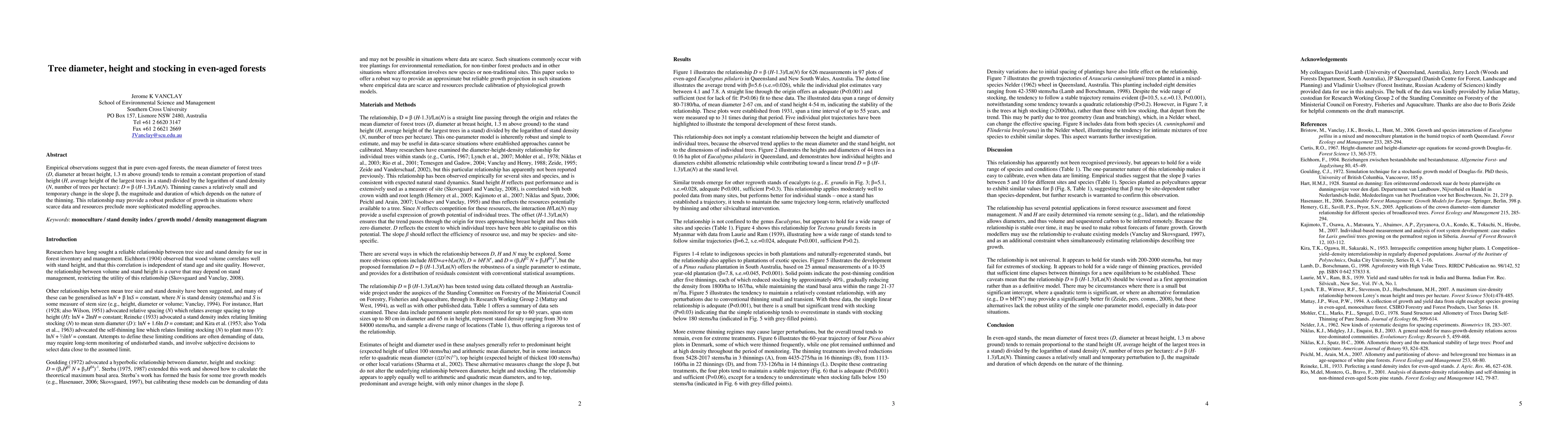 This study finds that in pure even-aged forests, tree diameter remains proportional to the ratio of stand height to the logarithm of stand density, with thinning causing minor, temporary changes in this relationship. This simple model can serve as a reliable predictor of forest growth when detailed data is unavailable.