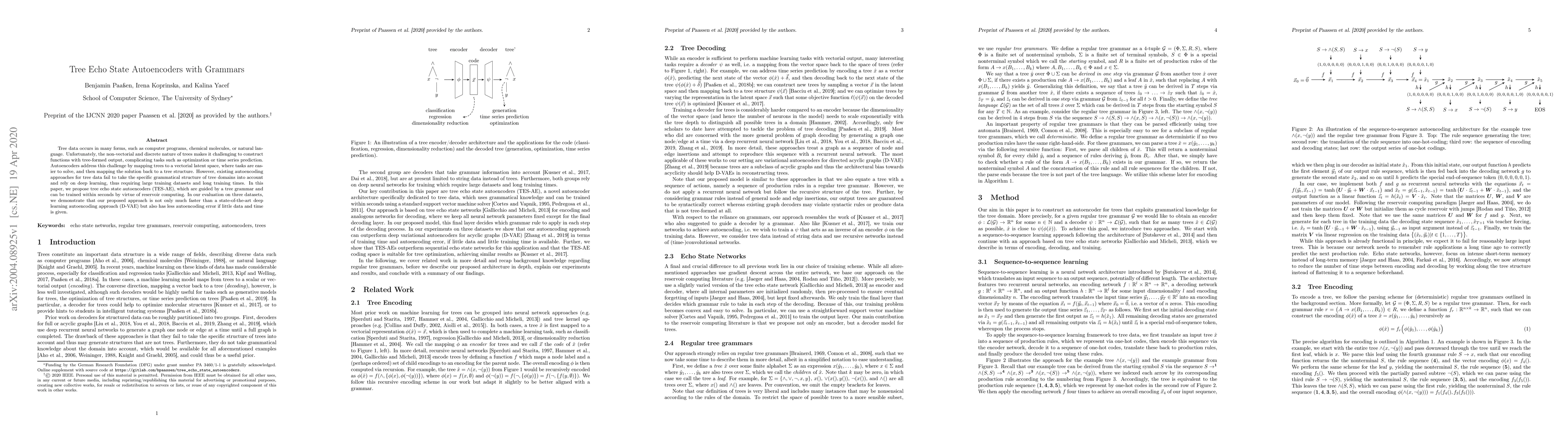 This paper proposes tree echo state autoencoders (TES-AE) to efficiently encode and decode tree-structured data, leveraging tree grammars and reservoir computing for faster training compared to deep learning methods. The evaluation shows that TES-AE is quicker and more accurate with limited data than state-of-the-art deep learning autoencoders.