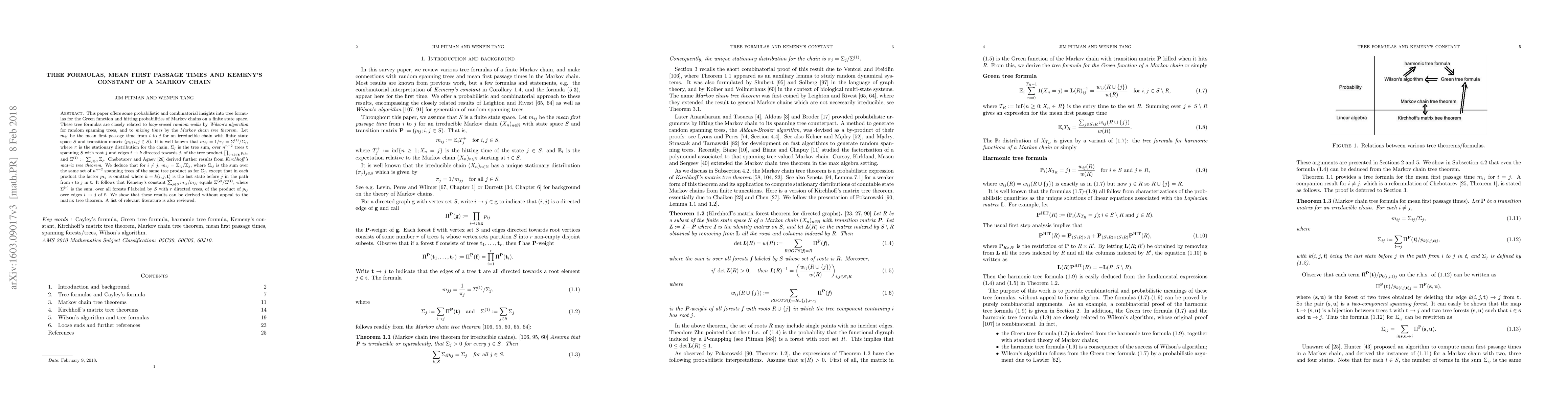 In this paper, we aim to provide probabilistic and combinatorial insights into tree formulas for the Green function and hitting probabilities of Markov chains on a finite state space. These tree formulas are closely related to loop-erased random walks by Wilson's algorithm for random spanning trees, and to mixing times by the Markov chain tree theorem. Let $m_{ij}$ be the mean first passage time from $i$ to $j$ for an irreducible chain with finite state space $S$ and transition matrix $(p_{ij}; i, j \in S)$. It is well-known that $m_{jj} = 1/\pi_j = \Sigma^{(1)}/\Sigma_j$, where $\pi$ is the stationary distribution for the chain, $\Sigma_j$ is the tree sum, over $n^{n-2}$ trees $\textbf{t}$ spanning $S$ with root $j$ and edges $i \rightarrow k$ directed to $j$, of the tree product $\prod_{i \rightarrow k \in \textbf{t} }p_{ik}$, and $\Sigma^{(1)}:= \sum_{j \in S} \Sigma_j$. Chebotarev and Agaev derived further results from {\em Kirchhoff's matrix tree theorem}. We deduce that for $i \ne j$, $m_{ij} = \Sigma_{ij}/\Sigma_j$, where $\Sigma_{ij}$ is the sum over the same set of $n^{n-2}$ spanning trees of the same tree product as for $\Sigma_j$, except that in each product the factor $p_{kj}$ is omitted where $k = k(i,j,\textbf{t})$ is the last state before $j$ in the path from $i$ to $j$ in $\textbf{t}$. It follows that Kemeny's constant $\sum_{j \in S} m_{ij}/m_{jj}$ equals to $ \Sigma^{(2)}/\Sigma^{(1)}$, where $\Sigma^{(r)}$ is the sum, over all forests $\textbf{f}$ labeled by $S$ with $r$ trees, of the product of $p_{ij}$ over edges $i \rightarrow j$ of $\textbf{t}$. We show that these results can be derived without appeal to the matrix tree theorem. A list of relevant literature is also reviewed.