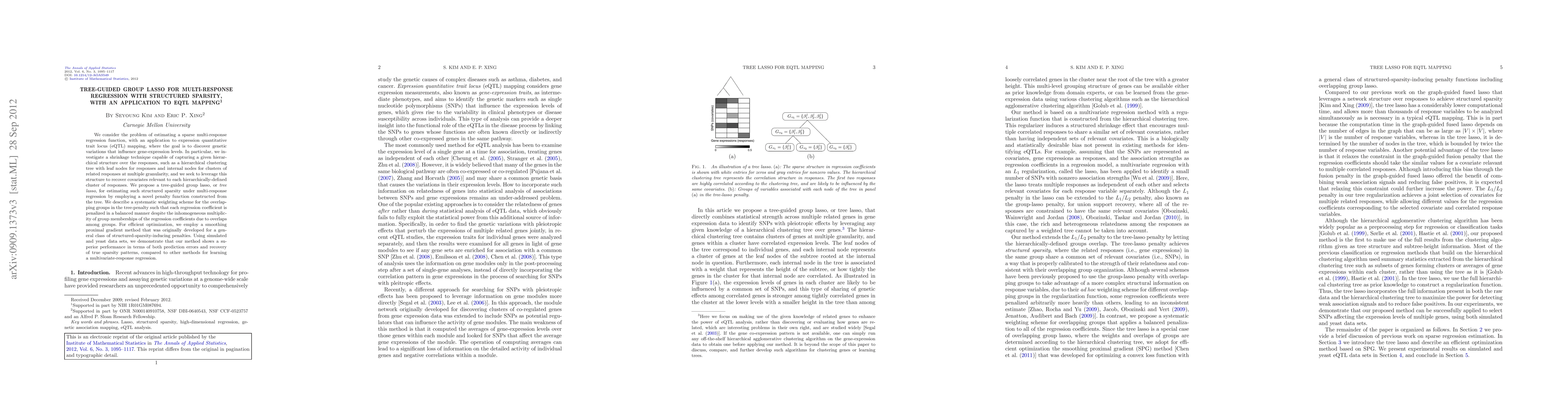 This paper proposes a tree-guided group lasso method, termed tree lasso, for estimating structured sparsity in multi-response regression, particularly for eQTL mapping. The method leverages hierarchical response structures and employs a novel penalty function to balance penalties for overlapping groups, demonstrating superior performance in simulations and yeast data.