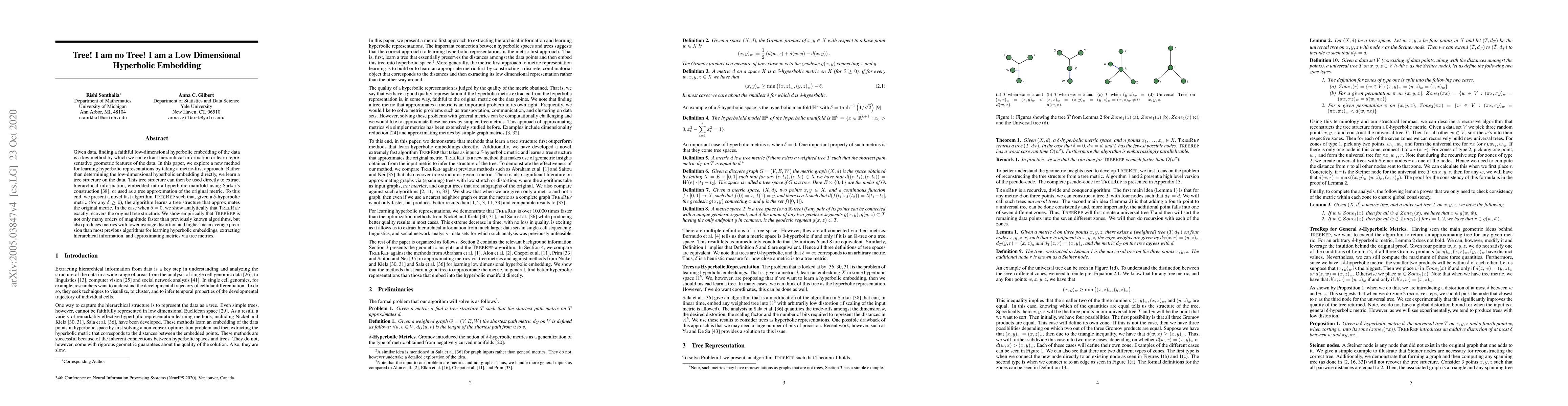 This paper introduces a novel method called \textsc{TreeRep} for learning hyperbolic representations by first constructing a tree structure that approximates the original metric. The method is significantly faster than previous algorithms and produces embeddings with lower distortion and higher precision.