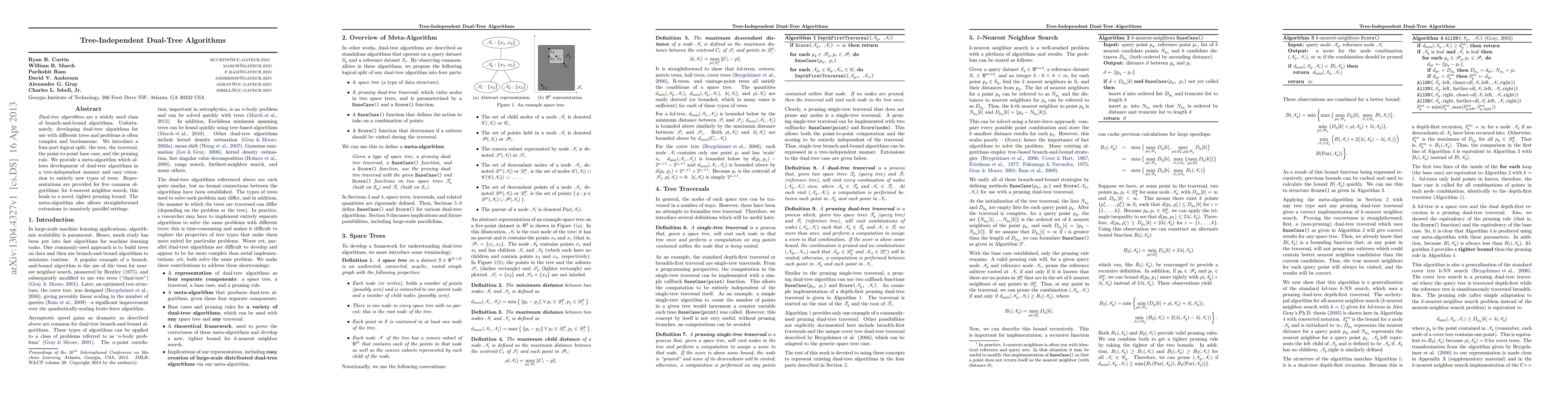 Dual-tree algorithms are a widely used class of branch-and-bound algorithms. Unfortunately, developing dual-tree algorithms for use with different trees and problems is often complex and burdensome. We introduce a four-part logical split: the tree, the traversal, the point-to-point base case, and the pruning rule. We provide a meta-algorithm which allows development of dual-tree algorithms in a tree-independent manner and easy extension to entirely new types of trees. Representations are provided for five common algorithms; for k-nearest neighbor search, this leads to a novel, tighter pruning bound. The meta-algorithm also allows straightforward extensions to massively parallel settings.