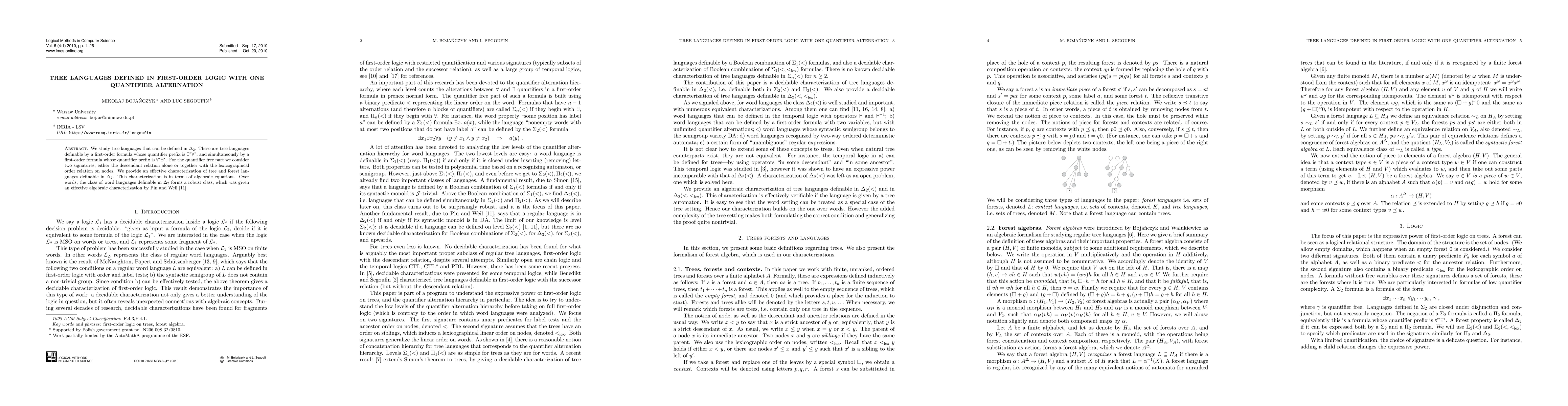The paper studies tree languages definable in first-order logic with one quantifier alternation, focusing on Δ₂(<) with the descendant relation and considering two signatures: the descendant relation alone and together with the lexicographical order relation on nodes.