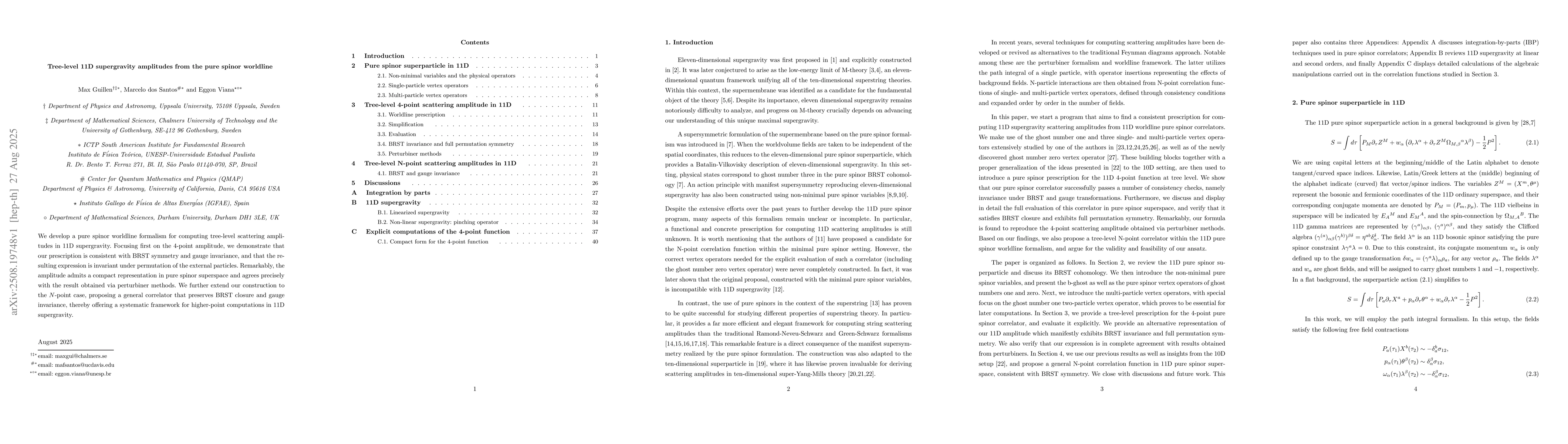 We develop a pure spinor worldline formalism for computing tree-level scattering amplitudes in 11D supergravity. Focusing first on the 4-point amplitude, we demonstrate that our prescription is consistent with BRST symmetry and gauge invariance, and that the resulting expression is invariant under permutation of the external particles. Remarkably, the amplitude admits a compact representation in pure spinor superspace and agrees precisely with the result obtained via perturbiner methods. We further extend our construction to the N-point case, proposing a general correlator that preserves BRST closure and gauge invariance, thereby offering a systematic framework for higher-point computations in 11D supergravity.