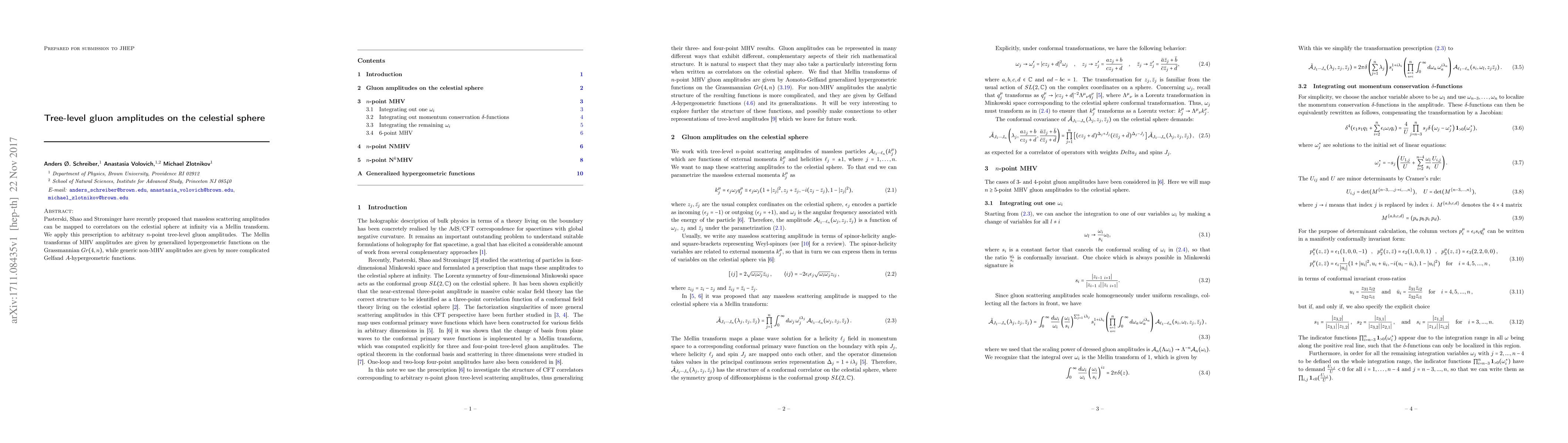 This research applies the celestial sphere prescription for scattering amplitudes to tree-level gluon amplitudes, revealing that MHV amplitudes correspond to generalized hypergeometric functions on the Grassmannian, while non-MHV amplitudes involve more complex Gelfand $A$-hypergeometric functions.