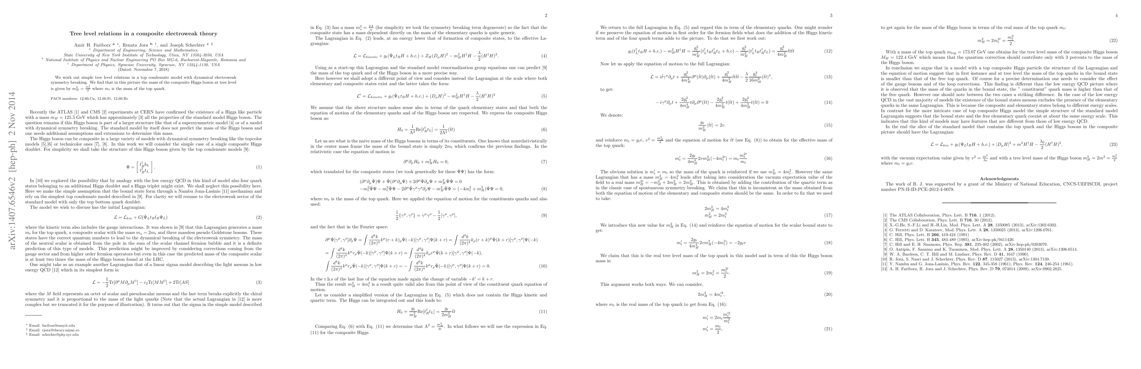 Summary: This paper explores tree-level relations in a composite electroweak theory with a top condensate model, revealing that the composite Higgs boson mass at tree level is $m_H^2=\frac{m_t^2}{2}$, where $m_t$ is the top quark mass.