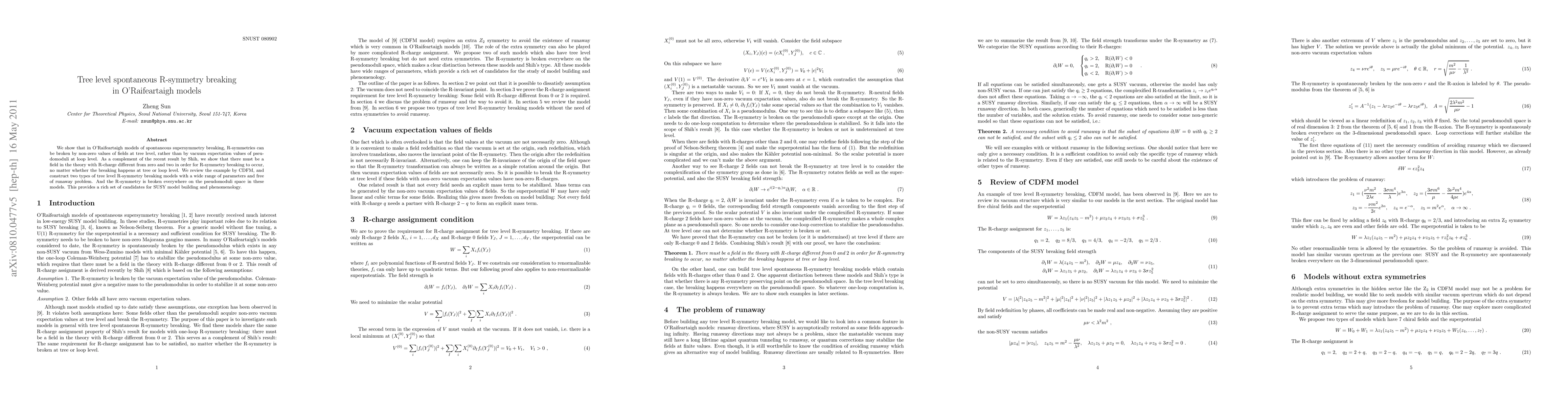 This paper demonstrates that in O'Raifeartaigh models, R-symmetry can break spontaneously at tree level through non-zero field values, rather than at loop level via pseudomoduli. It also establishes that a field with R-charge different from zero or two is necessary for R-symmetry breaking, regardless of the level.
