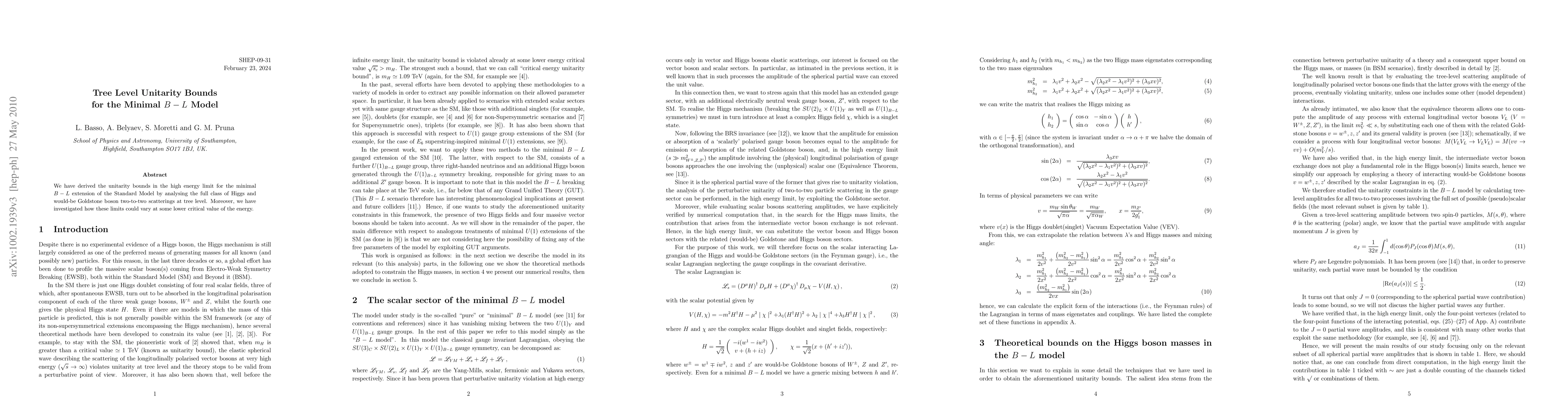Researchers derived unitarity bounds for the minimal B-L extension of the Standard Model using tree-level Higgs and Goldstone boson scatterings at high energy, exploring potential variations at lower energies.