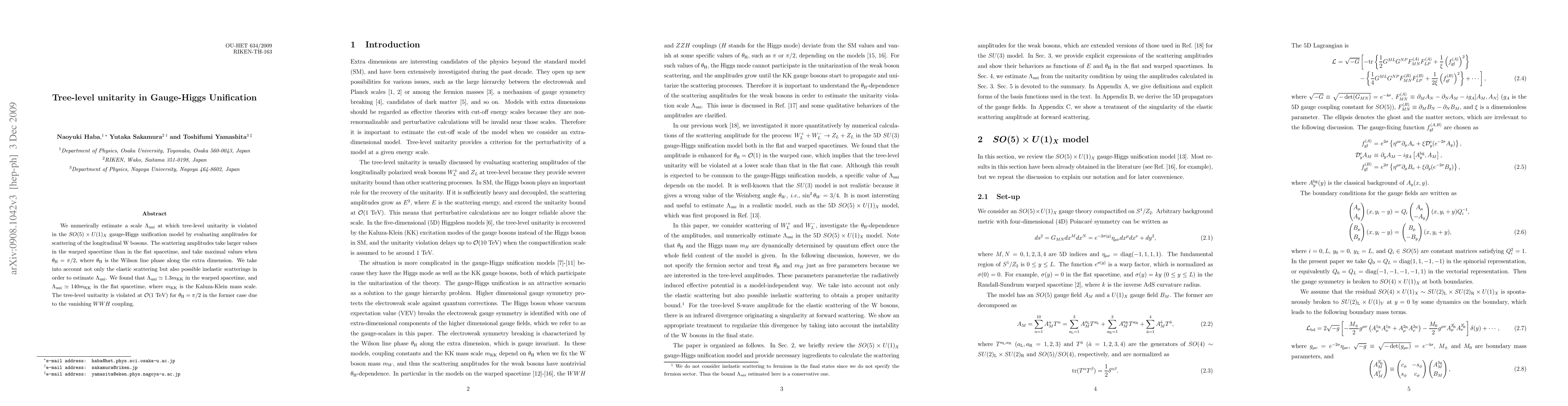 This research calculates the scale $Lambda_{uni}$ at which tree-level unitarity is breached in the $SO(5) imes U(1)_X$ gauge-Higgs unification model. Utilizing warped and flat spacetime simulations, it finds $Lambda_{ m uni}simeq 1.3m_{KK}$ in warped spacetime and $Lambda_{ m uni}simeq 140m_{KK}$ in flat spacetime. Unitarity violation occurs at $O(1TeV)$ for $ heta_H=pi/2$ in warped spacetime, highlighting the model's limitations.