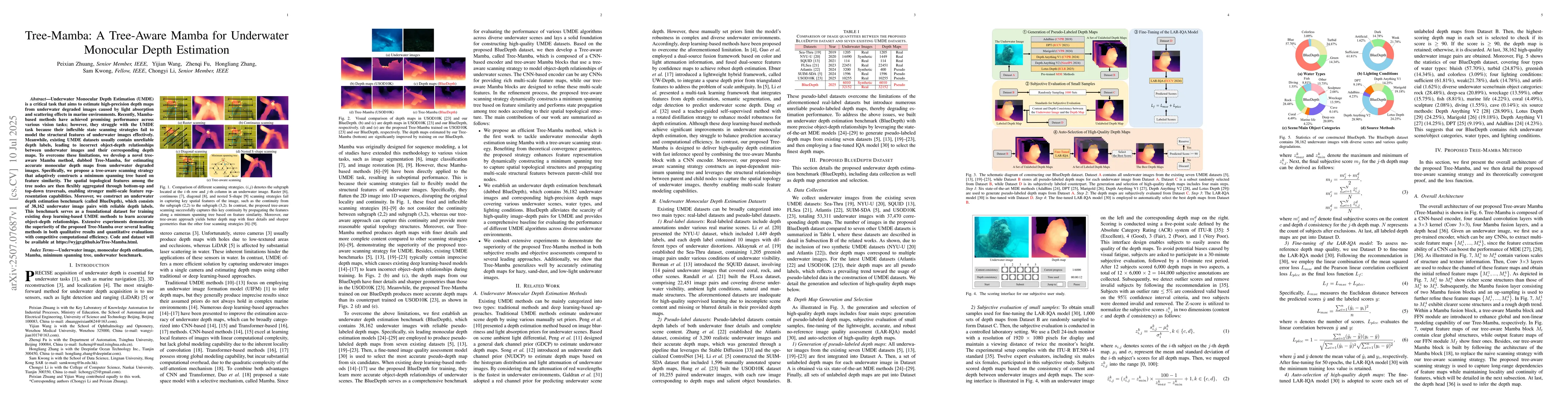 Underwater Monocular Depth Estimation (UMDE) is a critical task that aims to estimate high-precision depth maps from underwater degraded images caused by light absorption and scattering effects in marine environments. Recently, Mamba-based methods have achieved promising performance across various vision tasks; however, they struggle with the UMDE task because their inflexible state scanning strategies fail to model the structural features of underwater images effectively. Meanwhile, existing UMDE datasets usually contain unreliable depth labels, leading to incorrect object-depth relationships between underwater images and their corresponding depth maps. To overcome these limitations, we develop a novel tree-aware Mamba method, dubbed Tree-Mamba, for estimating accurate monocular depth maps from underwater degraded images. Specifically, we propose a tree-aware scanning strategy that adaptively constructs a minimum spanning tree based on feature similarity. The spatial topological features among the tree nodes are then flexibly aggregated through bottom-up and top-down traversals, enabling stronger multi-scale feature representation capabilities. Moreover, we construct an underwater depth estimation benchmark (called BlueDepth), which consists of 38,162 underwater image pairs with reliable depth labels. This benchmark serves as a foundational dataset for training existing deep learning-based UMDE methods to learn accurate object-depth relationships. Extensive experiments demonstrate the superiority of the proposed Tree-Mamba over several leading methods in both qualitative results and quantitative evaluations with competitive computational efficiency. Code and dataset will be available at https://wyjgr.github.io/Tree-Mamba.html.
