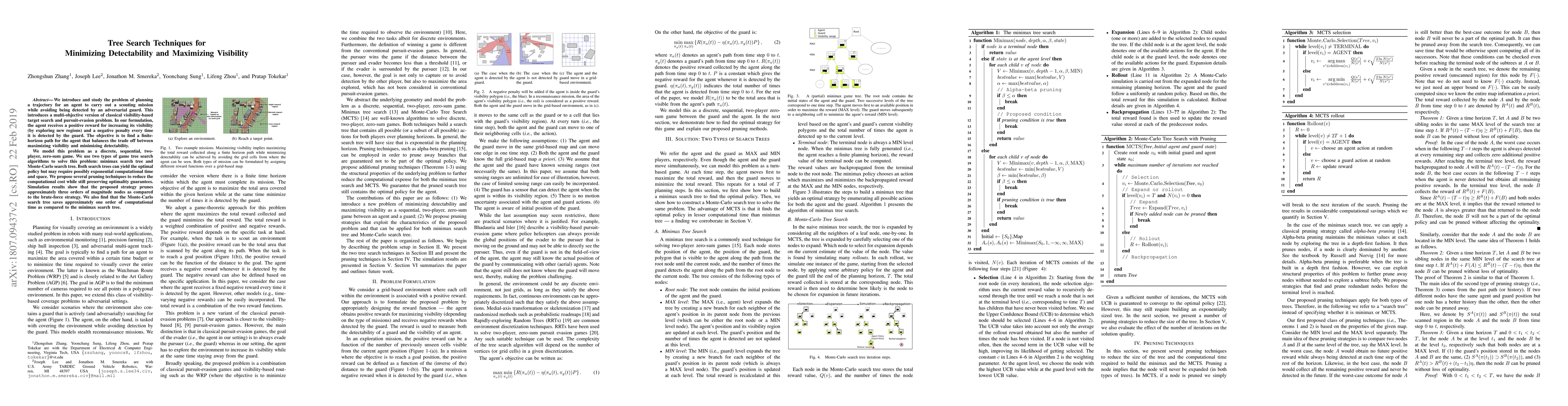 This research introduces an adversarial version of visibility planning problems, aiming to balance maximizing an agent's visibility and minimizing detection by an adversarial guard. Utilizing a minimax tree search within a discrete game model, the paper proposes pruning techniques to reduce computational costs while maintaining optimality. Simulations demonstrate that these strategies significantly decrease computation, approximately pruning three orders of magnitude of nodes compared to brute-force methods.