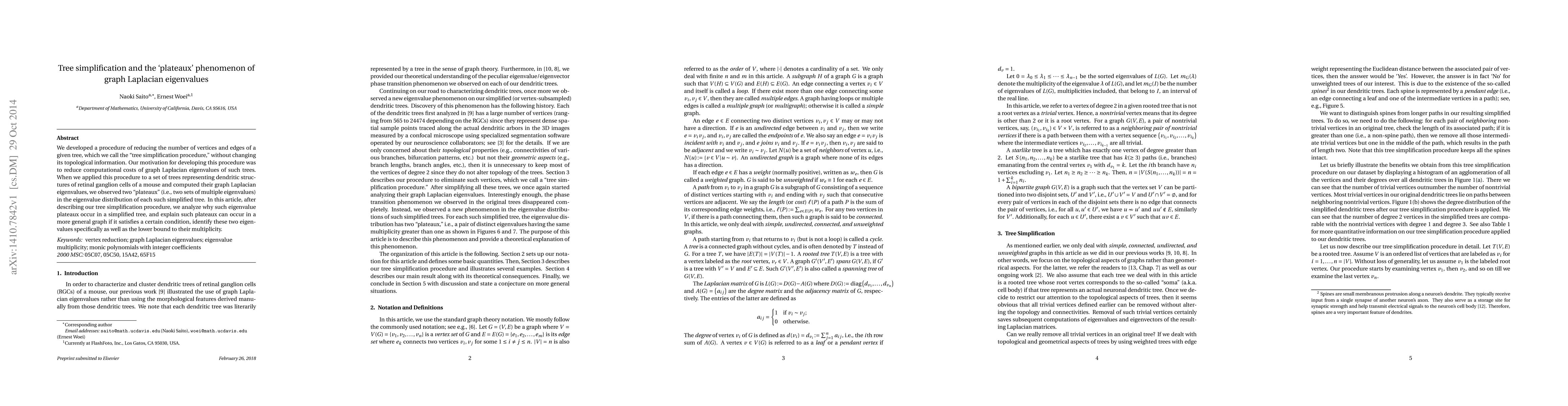 We developed a procedure of reducing the number of vertices and edges of a given tree, which we call the "tree simplification procedure," without changing its topological information. Our motivation for developing this procedure was to reduce computational costs of graph Laplacian eigenvalues of such trees. When we applied this procedure to a set of trees representing dendritic structures of retinal ganglion cells of a mouse and computed their graph Laplacian eigenvalues, we observed two "plateaux" (i.e., two sets of multiple eigenvalues) in the eigenvalue distribution of each such simplified tree. In this article, after describing our tree simplification procedure, we analyze why such eigenvalue plateaux occur in a simplified tree, and explain such plateaux can occur in a more general graph if it satisfies a certain condition, identify these two eigenvalues specifically as well as the lower bound to their multiplicity.