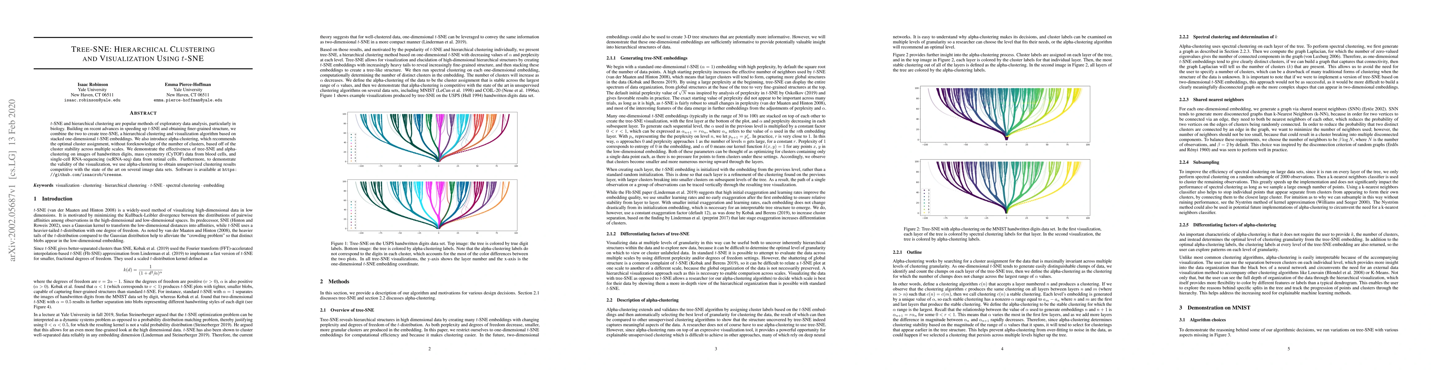 t-SNE and hierarchical clustering are popular methods of exploratory data analysis, particularly in biology. Building on recent advances in speeding up t-SNE and obtaining finer-grained structure, we combine the two to create tree-SNE, a hierarchical clustering and visualization algorithm based on stacked one-dimensional t-SNE embeddings. We also introduce alpha-clustering, which recommends the optimal cluster assignment, without foreknowledge of the number of clusters, based off of the cluster stability across multiple scales. We demonstrate the effectiveness of tree-SNE and alpha-clustering on images of handwritten digits, mass cytometry (CyTOF) data from blood cells, and single-cell RNA-sequencing (scRNA-seq) data from retinal cells. Furthermore, to demonstrate the validity of the visualization, we use alpha-clustering to obtain unsupervised clustering results competitive with the state of the art on several image data sets. Software is available at https://github.com/isaacrob/treesne.