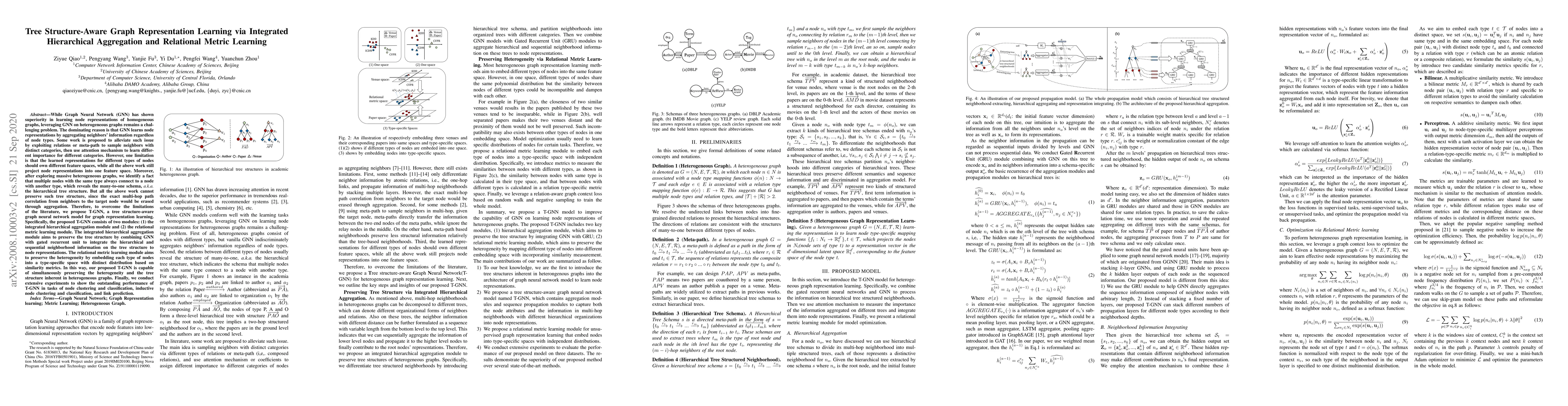 While Graph Neural Network (GNN) has shown superiority in learning node representations of homogeneous graphs, leveraging GNN on heterogeneous graphs remains a challenging problem. The dominating reason is that GNN learns node representations by aggregating neighbors' information regardless of node types. Some work is proposed to alleviate such issue by exploiting relations or meta-path to sample neighbors with distinct categories, then use attention mechanism to learn different importance for different categories. However, one limitation is that the learned representations for different types of nodes should own different feature spaces, while all the above work still project node representations into one feature space. Moreover, after exploring massive heterogeneous graphs, we identify a fact that multiple nodes with the same type always connect to a node with another type, which reveals the many-to-one schema, a.k.a. the hierarchical tree structure. But all the above work cannot preserve such tree structure, since the exact multi-hop path correlation from neighbors to the target node would be erased through aggregation. Therefore, to overcome the limitations of the literature, we propose T-GNN, a tree structure-aware graph neural network model for graph representation learning. Specifically, the proposed T-GNN consists of two modules: (1) the integrated hierarchical aggregation module and (2) the relational metric learning module. The integrated hierarchical aggregation module aims to preserve the tree structure by combining GNN with Gated Recurrent Unit to integrate the hierarchical and sequential neighborhood information on the tree structure to node representations. The relational metric learning module aims to preserve the heterogeneity by embedding each type of nodes into a type-specific space with distinct distribution based on similarity metrics.