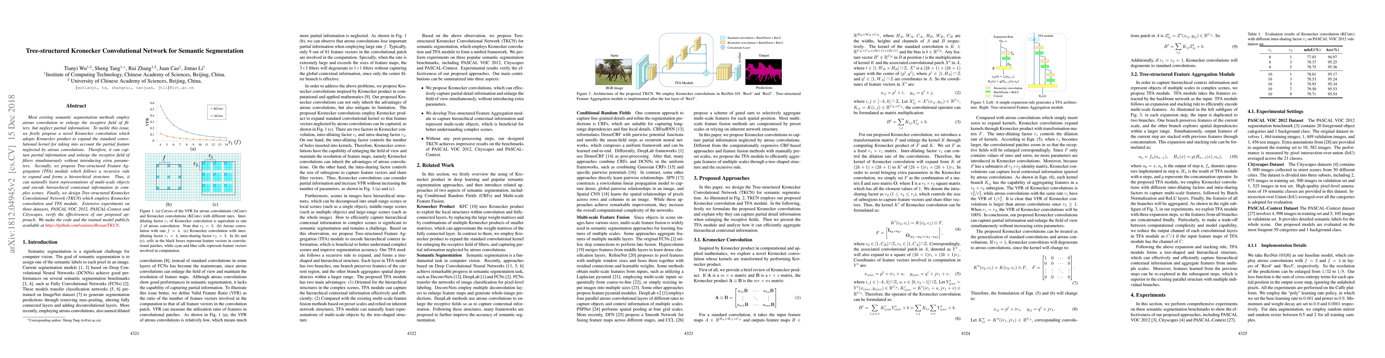 Most existing semantic segmentation methods employ atrous convolution to enlarge the receptive field of filters, but neglect partial information. To tackle this issue, we firstly propose a novel Kronecker convolution which adopts Kronecker product to expand the standard convolutional kernel for taking into account the partial feature neglected by atrous convolutions. Therefore, it can capture partial information and enlarge the receptive field of filters simultaneously without introducing extra parameters. Secondly, we propose Tree-structured Feature Aggregation (TFA) module which follows a recursive rule to expand and forms a hierarchical structure. Thus, it can naturally learn representations of multi-scale objects and encode hierarchical contextual information in complex scenes. Finally, we design Tree-structured Kronecker Convolutional Networks (TKCN) which employs Kronecker convolution and TFA module. Extensive experiments on three datasets, PASCAL VOC 2012, PASCAL-Context and Cityscapes, verify the effectiveness of our proposed approach. We make the code and the trained model publicly available at https://github.com/wutianyiRosun/TKCN.