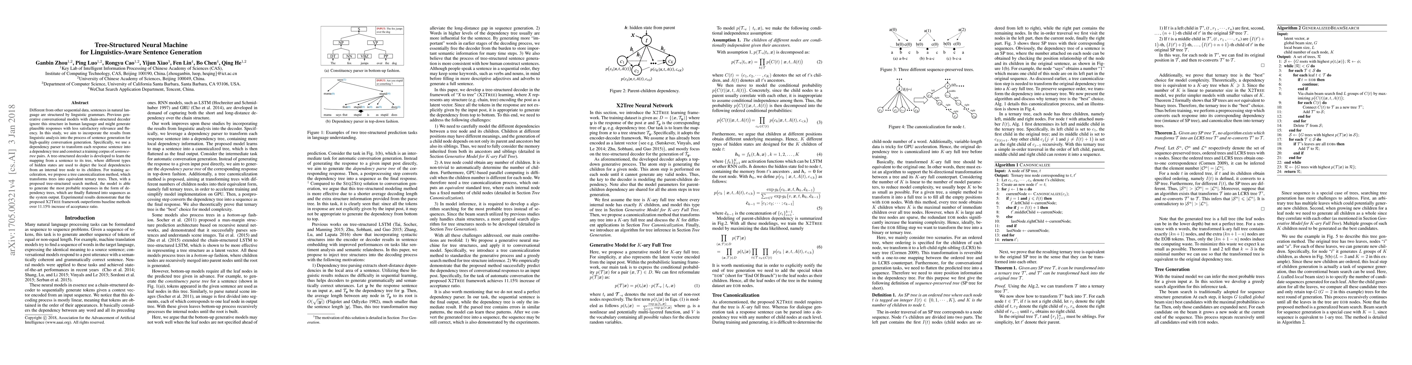 This paper proposes a tree-structured neural machine that integrates linguistic grammar into sentence generation, using a dependency tree parser and a tree-structured decoder to improve relevance and fluency in conversational responses. The X2Tree framework significantly outperforms baseline models by 11.15% in acceptance ratio.