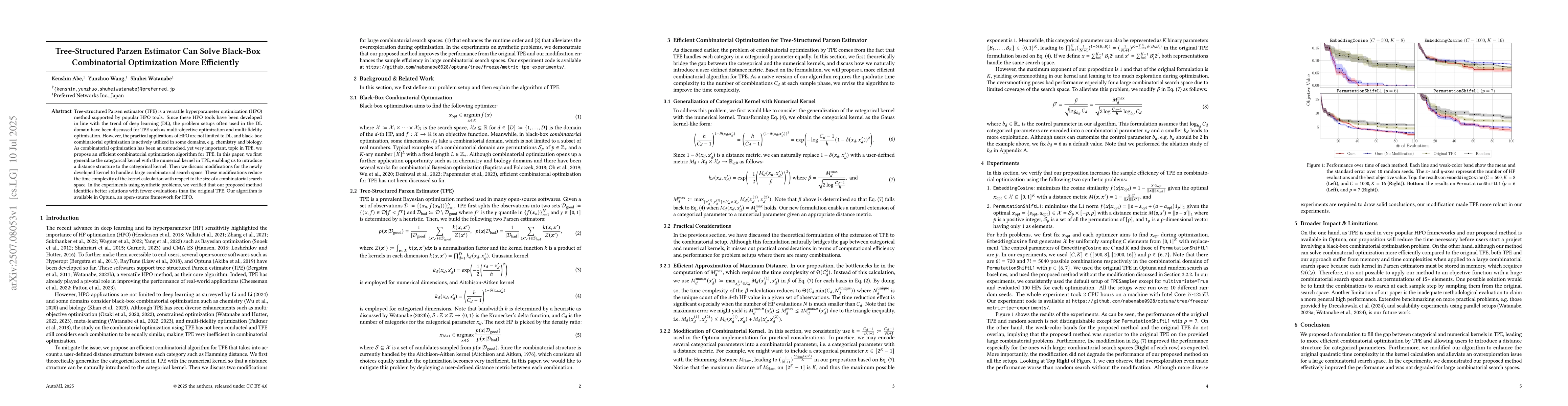 Tree-structured Parzen estimator (TPE) is a versatile hyperparameter optimization (HPO) method supported by popular HPO tools. Since these HPO tools have been developed in line with the trend of deep learning (DL), the problem setups often used in the DL domain have been discussed for TPE such as multi-objective optimization and multi-fidelity optimization. However, the practical applications of HPO are not limited to DL, and black-box combinatorial optimization is actively utilized in some domains, e.g., chemistry and biology. As combinatorial optimization has been an untouched, yet very important, topic in TPE, we propose an efficient combinatorial optimization algorithm for TPE. In this paper, we first generalize the categorical kernel with the numerical kernel in TPE, enabling us to introduce a distance structure to the categorical kernel. Then we discuss modifications for the newly developed kernel to handle a large combinatorial search space. These modifications reduce the time complexity of the kernel calculation with respect to the size of a combinatorial search space. In the experiments using synthetic problems, we verified that our proposed method identifies better solutions with fewer evaluations than the original TPE. Our algorithm is available in Optuna, an open-source framework for HPO.