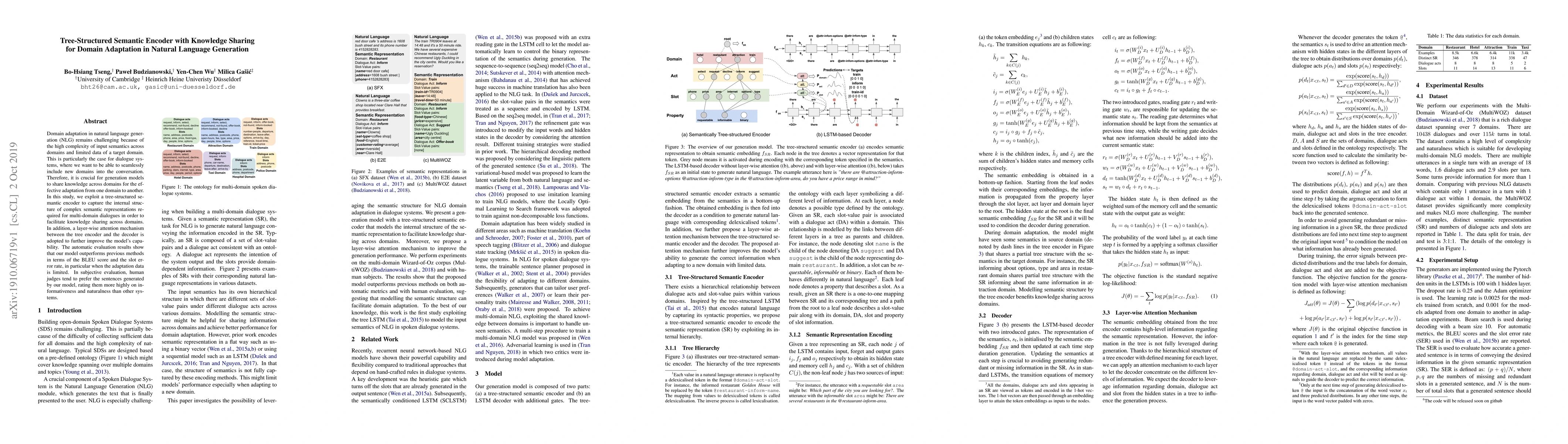 This paper proposes a tree-structured semantic encoder to capture complex semantic representations for domain adaptation in natural language generation, enhancing knowledge sharing across domains. The model, combined with a layer-wise attention mechanism, outperforms previous methods, especially with limited adaptation data, as shown by higher BLEU scores and lower slot error rates.