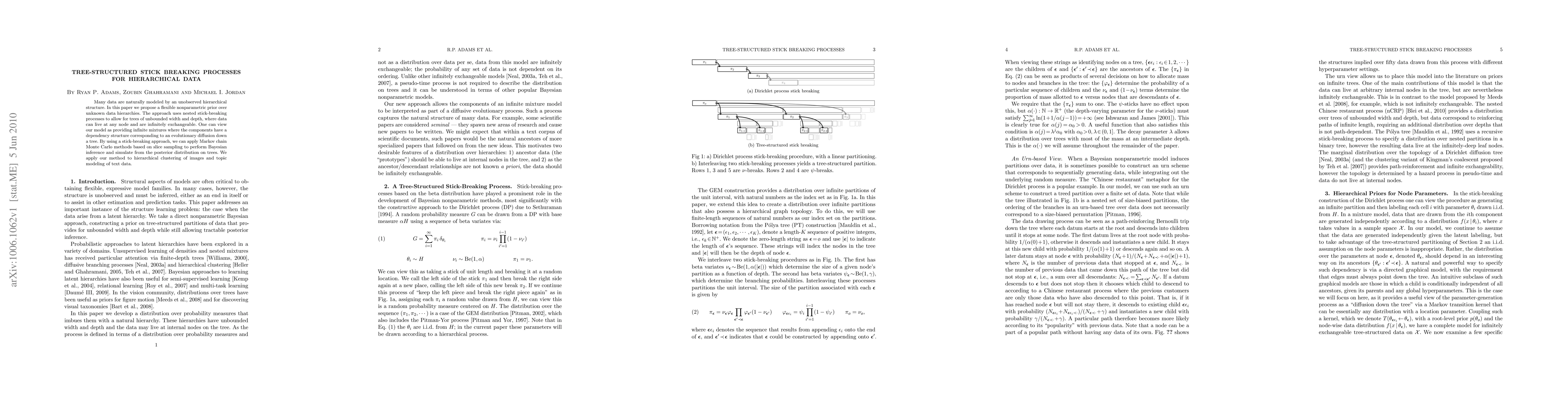 This paper introduces a flexible nonparametric prior using tree-structured stick-breaking processes for modeling hierarchical data, allowing for infinite mixtures with a dependency structure corresponding to evolutionary diffusion. The method enables Bayesian inference and posterior simulation via Markov chain Monte Carlo methods, demonstrated through applications in hierarchical clustering of images and topic modeling of text data.