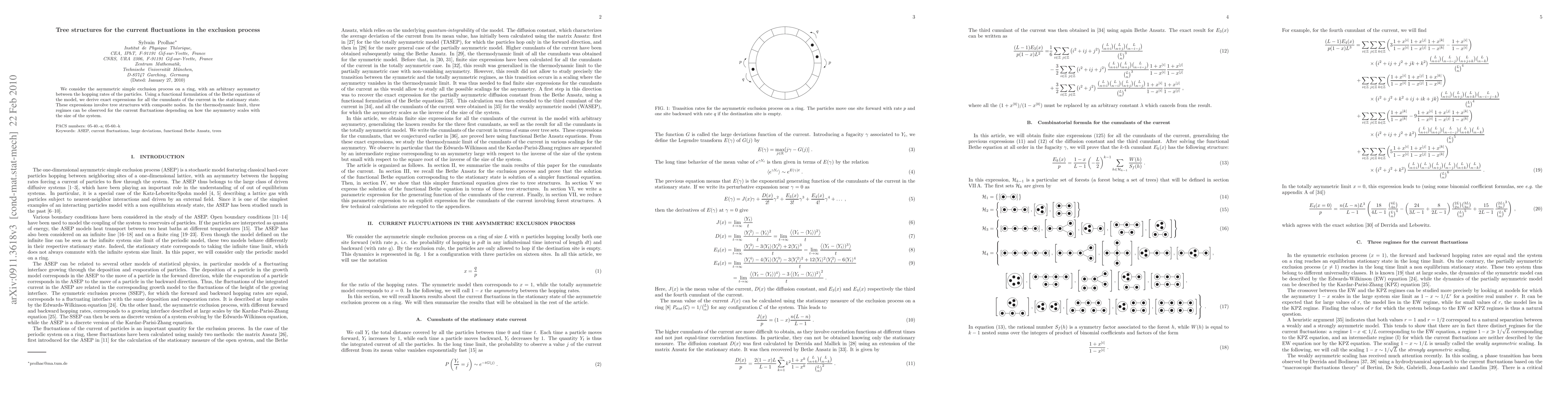 This paper derives exact expressions for the cumulants of current in an asymmetric simple exclusion process on a ring, revealing tree structures with composite nodes. It identifies three regimes for current fluctuations in the thermodynamic limit based on the scaling of asymmetry with system size.