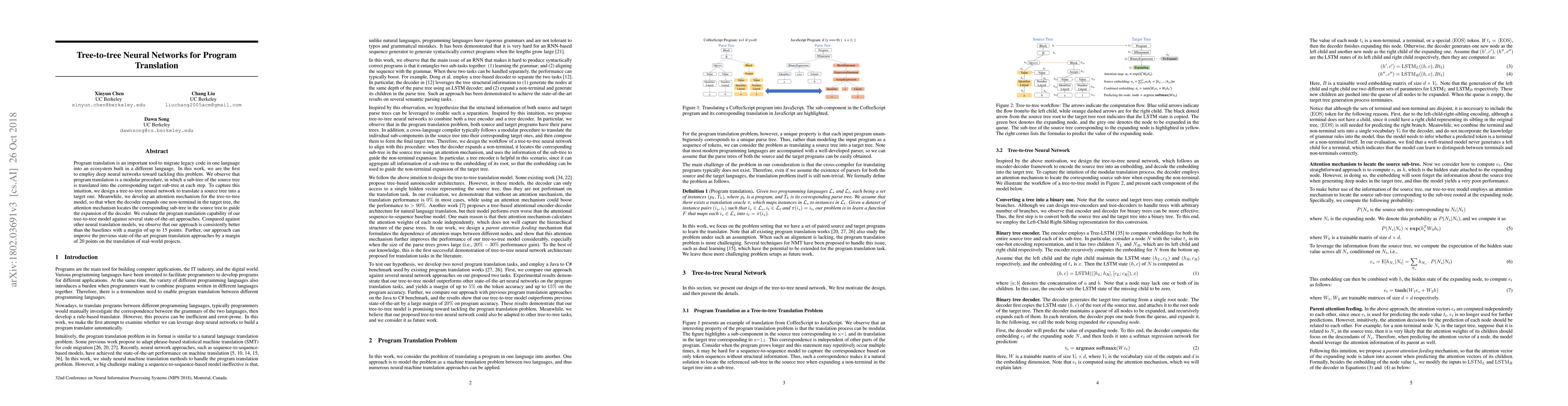 This paper introduces a tree-to-tree neural network with an attention mechanism for translating source code from one programming language to another, outperforming existing models by up to 15 points and improving the state-of-the-art by 20 points on real-world projects.