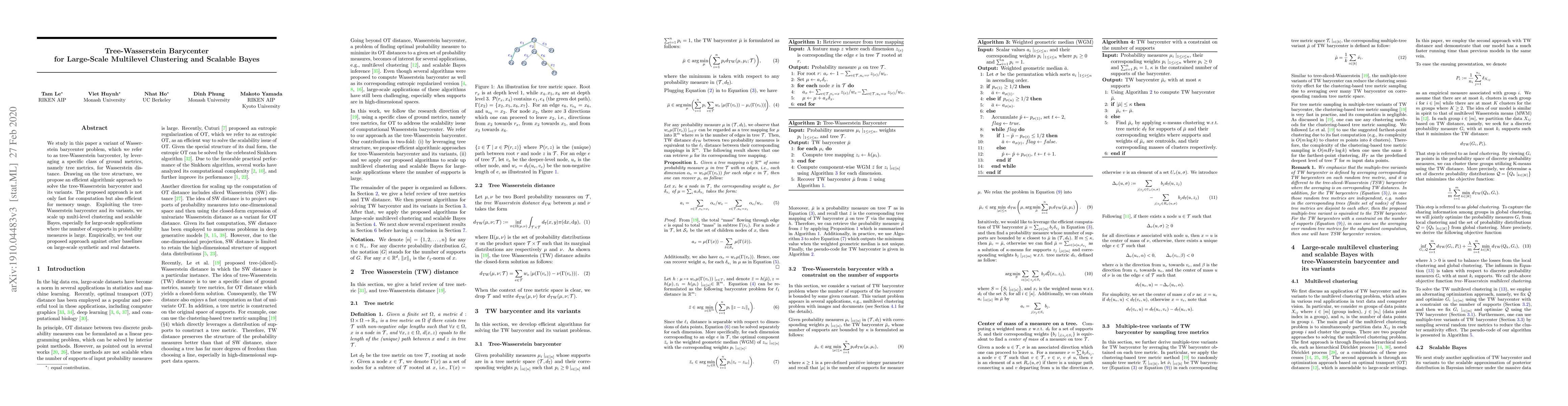 This paper introduces a tree-Wasserstein barycenter approach for solving large-scale multilevel clustering and scalable Bayes, leveraging efficient algorithms that optimize both computation speed and memory usage. Empirical tests on synthetic and real datasets demonstrate its effectiveness compared to other baselines.