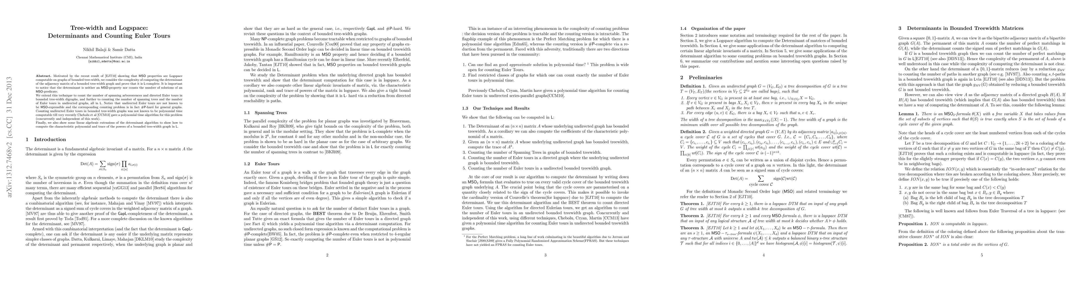 This paper proves that computing the determinant of a bounded tree-width graph's adjacency matrix is L-complete and extends this to count spanning arborescences, directed Euler tours, spanning trees, and Euler tours in both directed and undirected graphs, all in L. It also introduces linear algebraic extensions for computing the characteristic polynomial and trace of powers of such graphs.