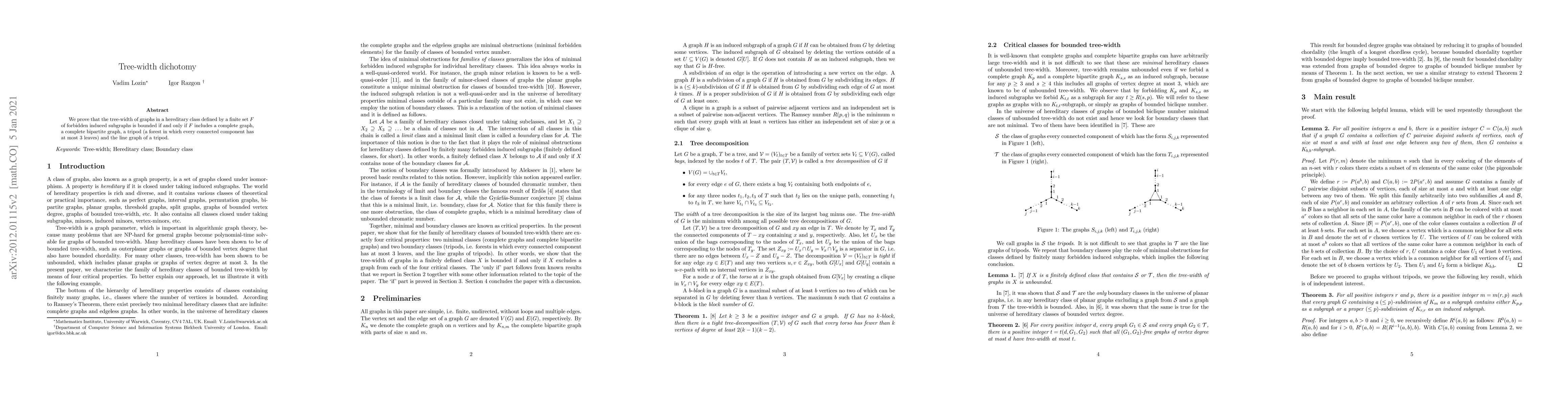 Summary: The paper establishes that the tree-width of graphs in a hereditary class is bounded if and only if the class includes specific forbidden subgraphs: a complete graph, a complete bipartite graph, a tripod, and the line graph of a tripod. This provides a complete characterization of such graph classes.
