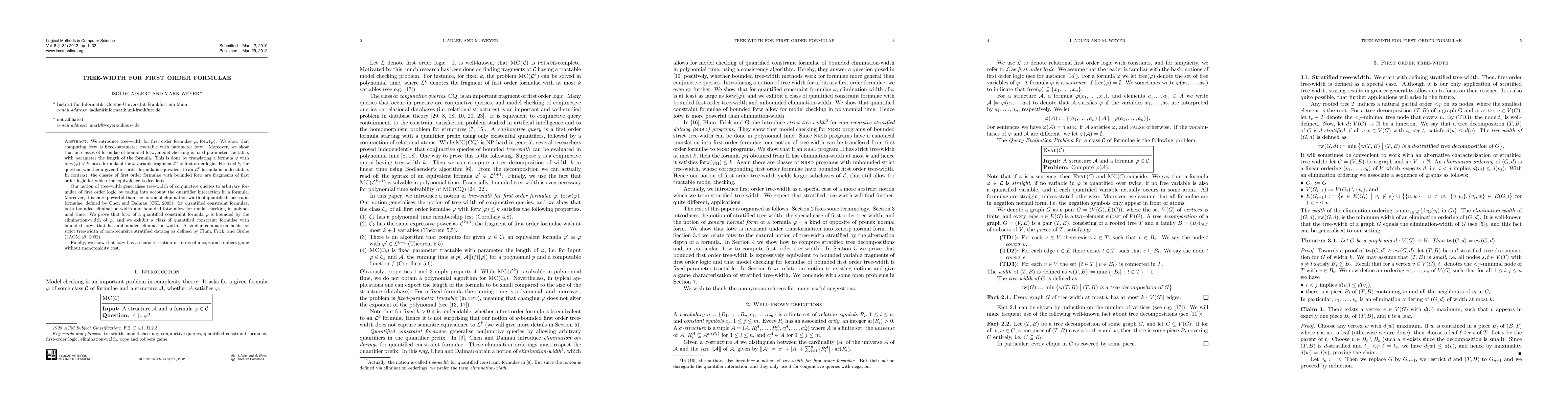We introduce tree-width for first order formulae \phi, fotw(\phi). We show