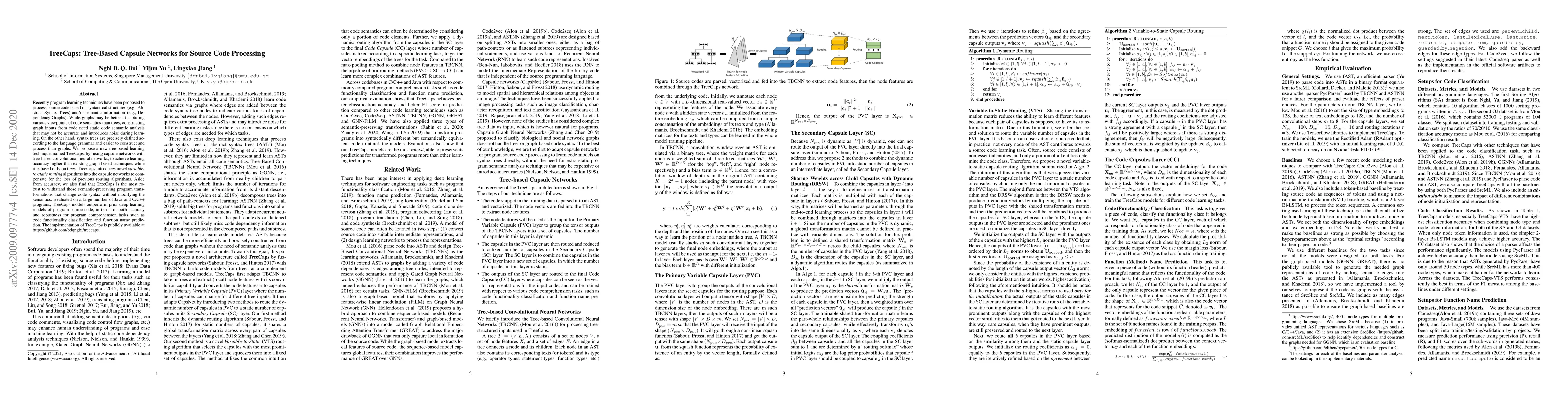 TreeCaps combines capsule networks with tree-based convolutional neural networks to surpass graph-based techniques in learning source code semantics, achieving higher accuracy and robustness based solely on Abstract Syntax Trees. This method introduces innovative routing algorithms to enhance performance and resilience against syntactic transformations.